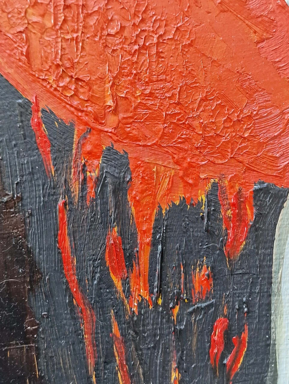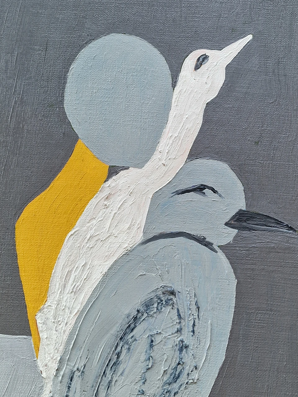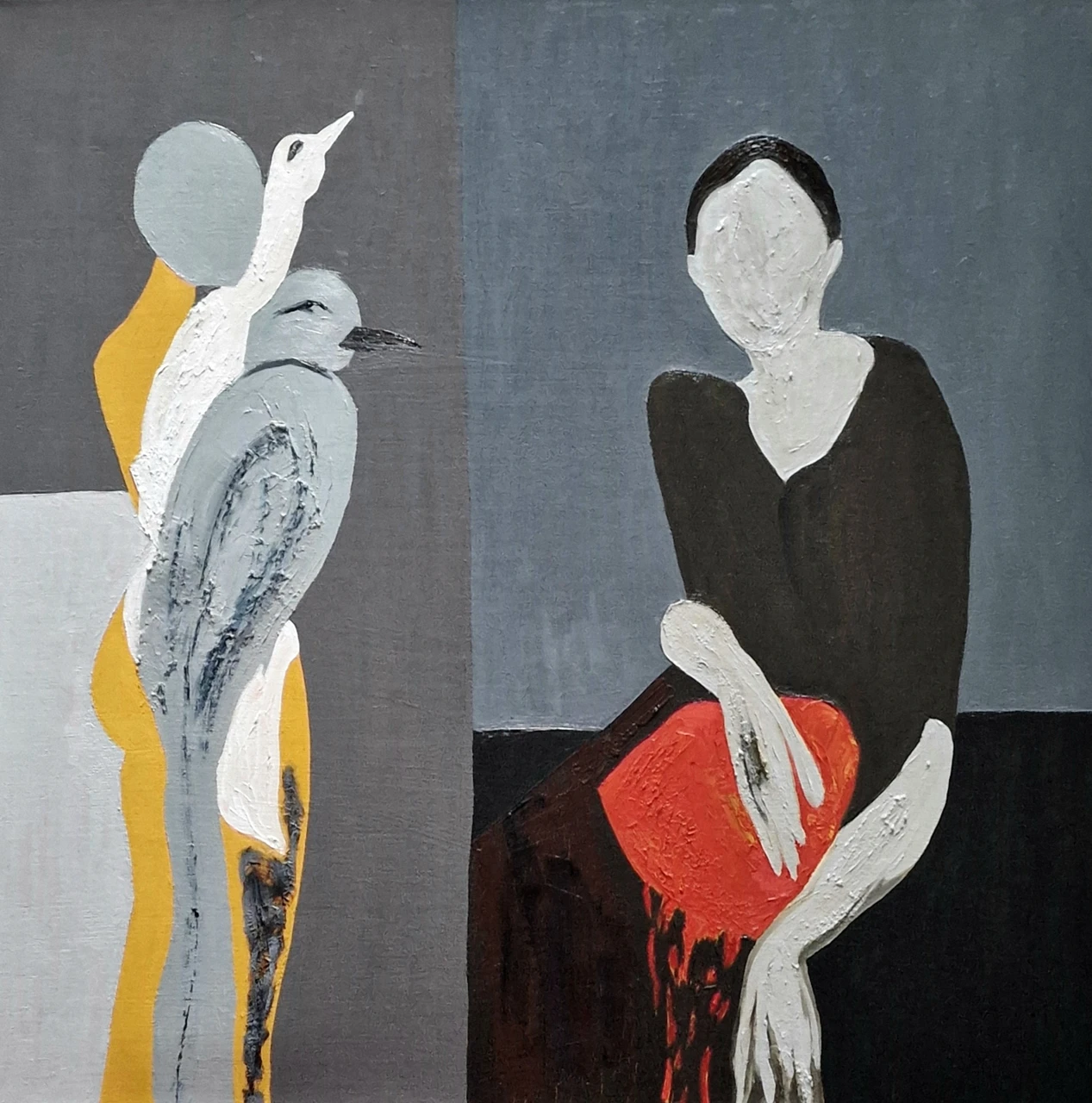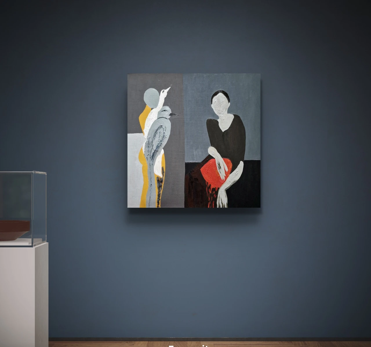 Две фигуры находятся рядом, но не вступают в прямой контакт. Между ними есть напряжение, которое держится на дистанции. Птица — не символ, а перенос состояния: она фиксирует точку внимания, которую невозможно удержать внутри фигуры. Красный элемент — это не эмоция,а сдвиг внутри конструкции.