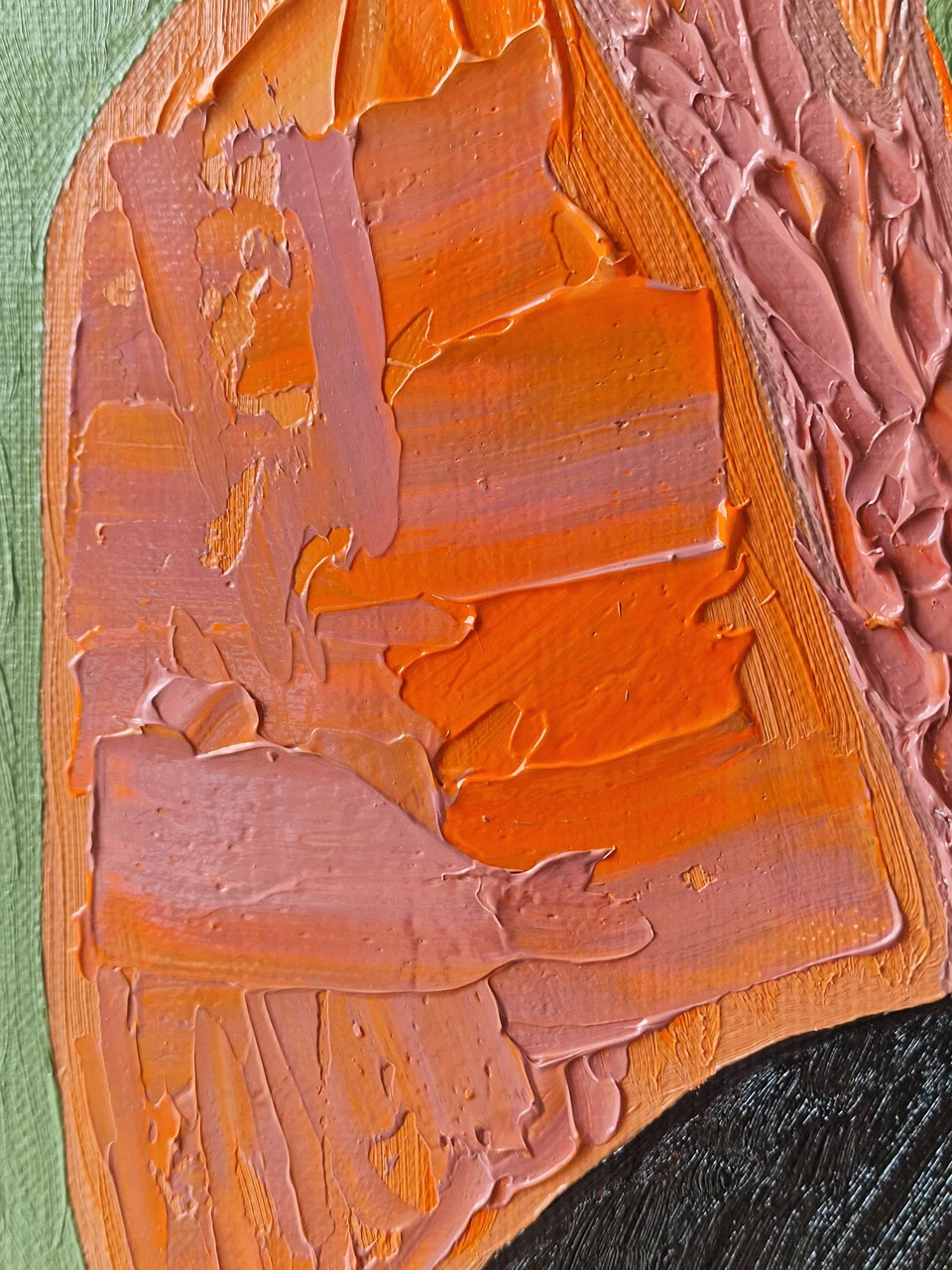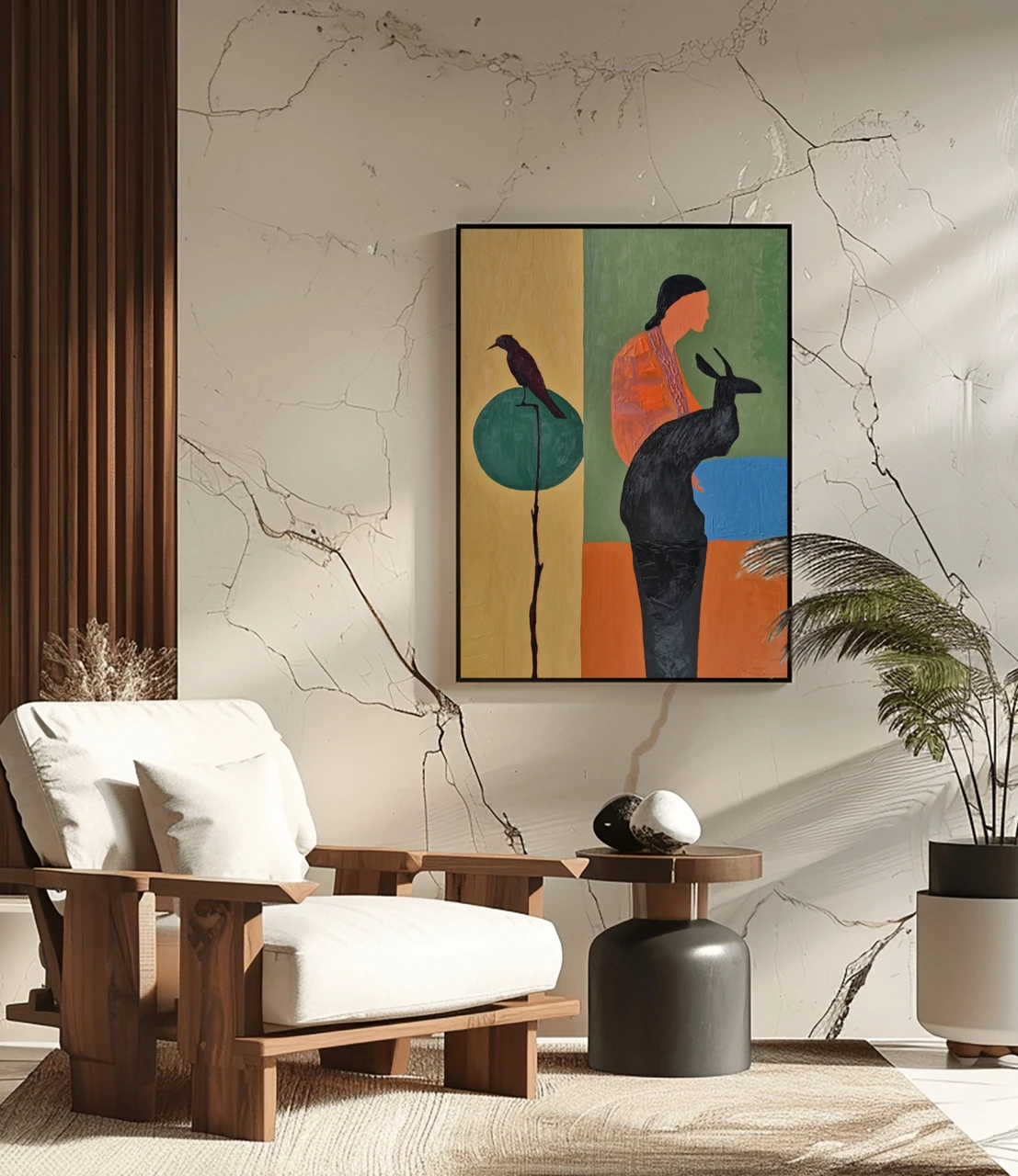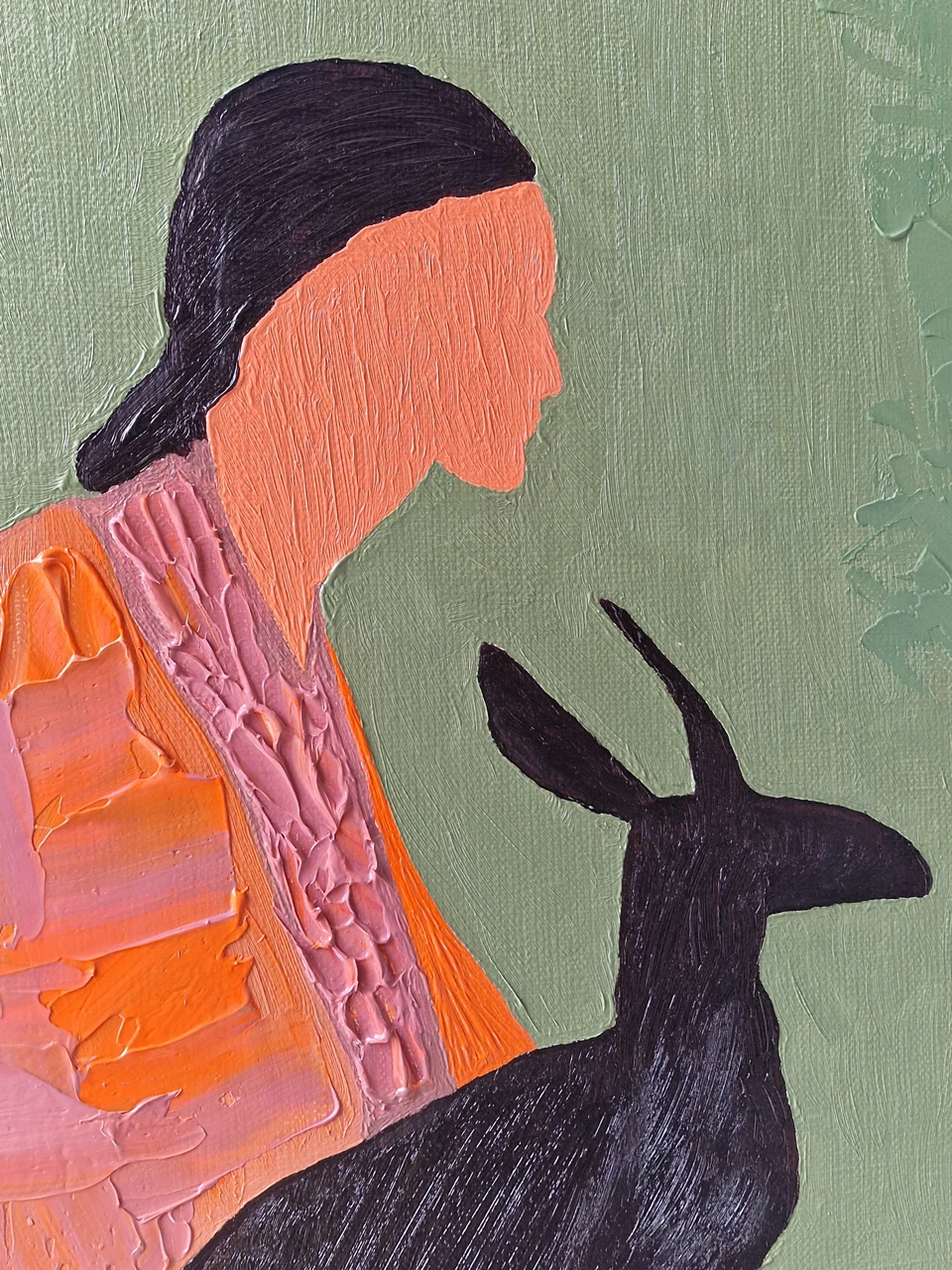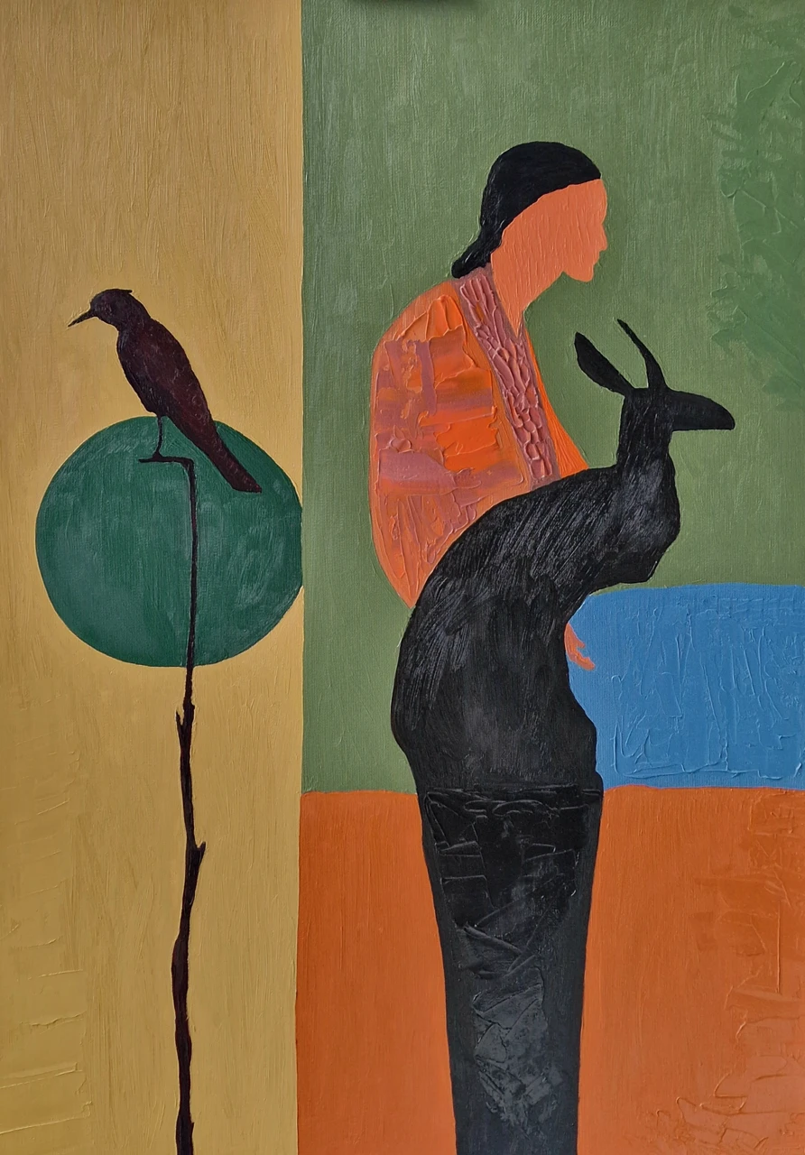 Фигура человека в профиль изображена рядом с силуэтами антилопы и птицы, сидящей на округлом «дереве». Плоские цветовые поля (оливковый терракотовый, охристый, лазурный черный) сочетаются с густыми пастозными мазками, создавая ощущение внутреннего равновесия Эта работа — о диалоге с дикой стороной человека. О том, как инстинкты и память становятся хранителями тишины. Материалы: холст, масло текстурированный слой с минеральными наполнителями.