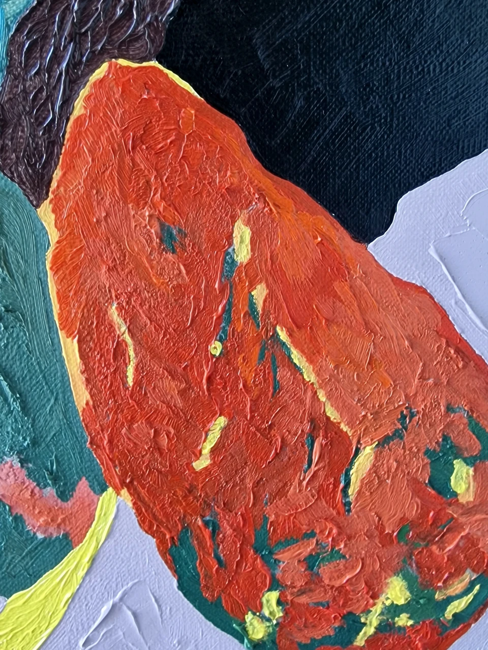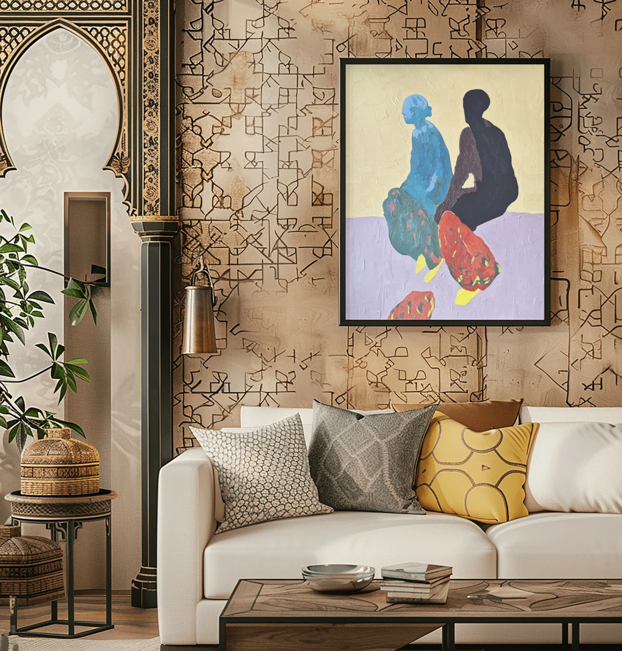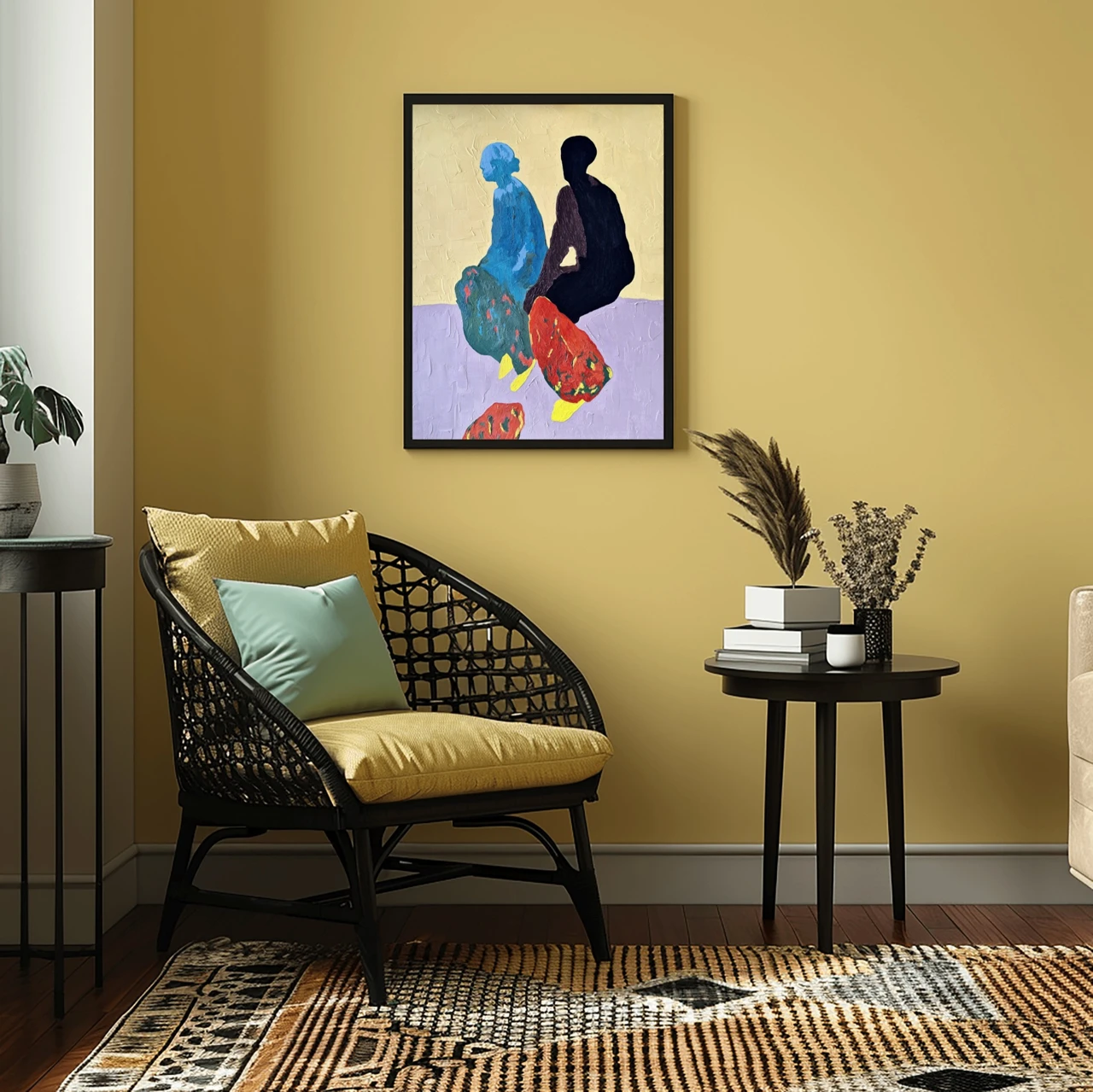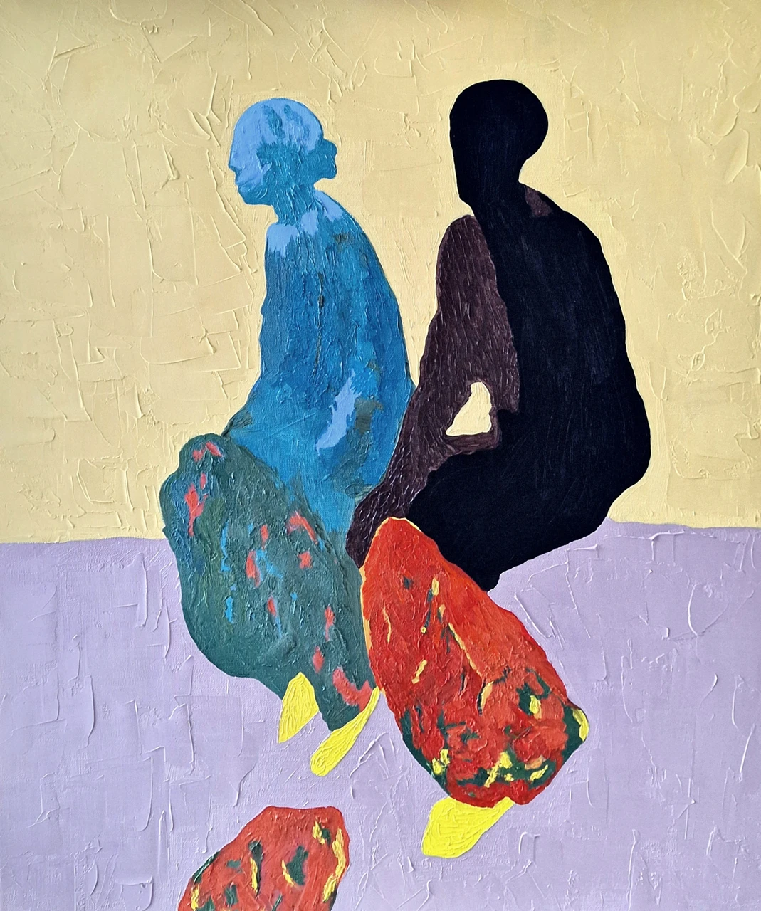 На картине изображены две абстрактные сидящие фигуры на текстурированном двухцветном фоне кремового и светло-фиолетового оттенков. Левая фигура написана бирюзово-синим цветом с видимыми мазками, а правая представляет собой чёткий чёрный силуэт, частично открывающий текстурированную коричневую форму. У обеих фигур ярко-жёлтые ступни, которые как бы привязывают их к нижней плоскости. Под ними на лиловом фоне разбросаны несколько неровных пастозных форм красно-оранжевого цвета с зелёными и жёлтыми акцентами, которые придают картине динамичность.