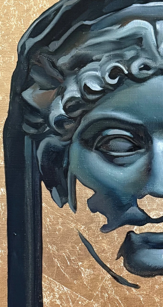 «Архетипы» материализуют идею Джеймса Хиллмана о том, что душа мира проявляется через его изменения. Классические головы со сколами — это не образы упадка, а свидетельства таких изменений, через которую архетип проникает в мир и способствует трансформации образа. Золотой фон здесь — не украшение, а поле имманентного — то, что Агамбен мог бы назвать «вечным присутствием», — на котором разворачивается драма взаимодействия между чистым абсолютом (золото) и её неизбежным воплощением в материи (мрамор).