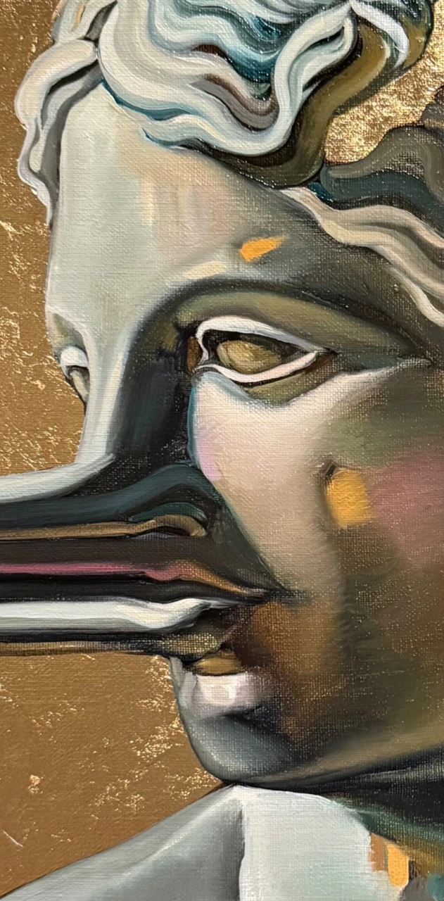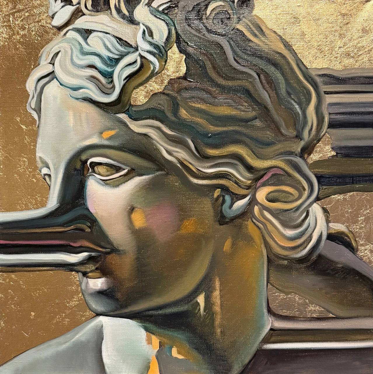 «Архетипы» материализуют идею Джеймса Хиллмана о том, что душа мира проявляется через его изменения. Классические головы со сколами — это не образы упадка, а свидетельства таких изменений, через которую архетип проникает в мир и способствует трансформации образа. Золотой фон здесь — не украшение, а поле имманентного — то, что Агамбен мог бы назвать «вечным присутствием», — на котором разворачивается драма взаимодействия между чистым абсолютом (золото) и её неизбежным воплощением в материи (мрамор).