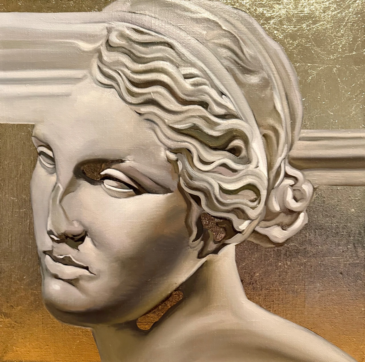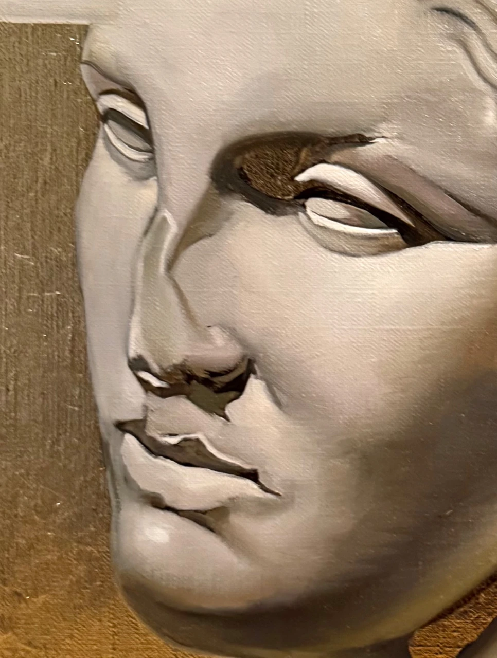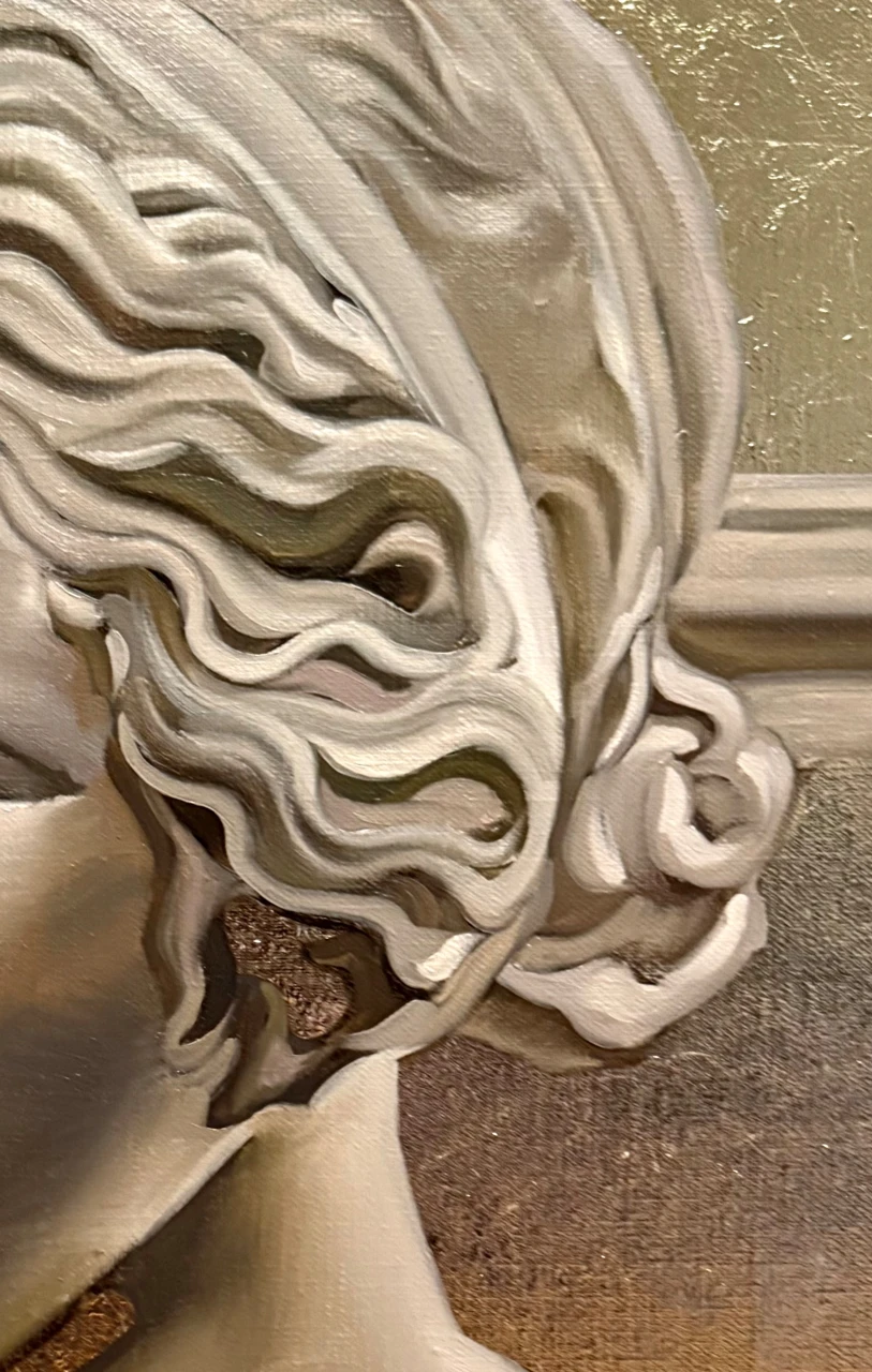 «Архетипы» материализуют идею Джеймса Хиллмана о том, что душа мира проявляется через его изменения. Классические головы со сколами — это не образы упадка, а свидетельства таких изменений, через которую архетип проникает в мир и способствует трансформации образа. Золотой фон здесь — не украшение, а поле имманентного — то, что Агамбен мог бы назвать «вечным присутствием», — на котором разворачивается драма взаимодействия между чистым абсолютом (золото) и её неизбежным воплощением в материи (мрамор).