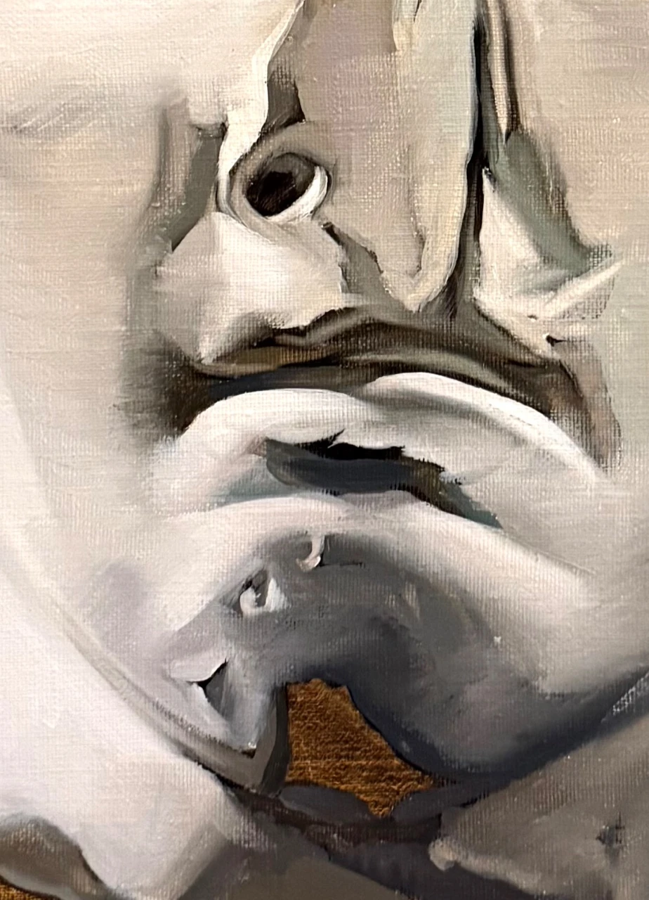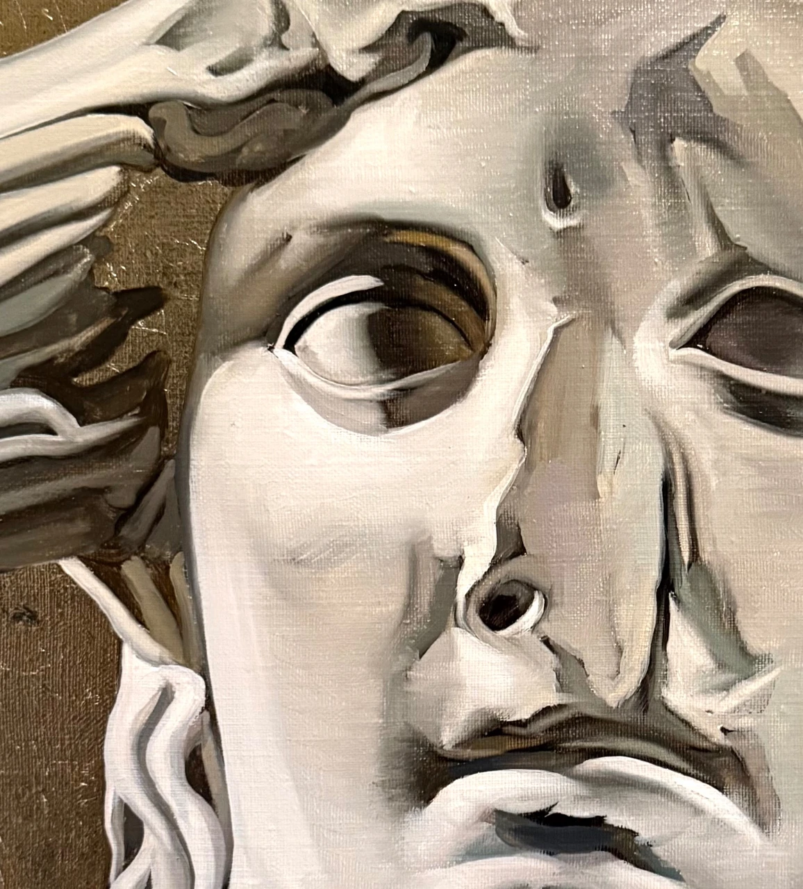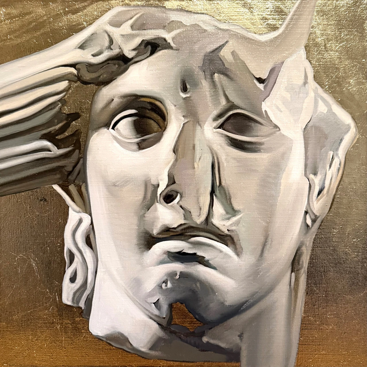 «Архетипы» материализуют идею Джеймса Хиллмана о том, что душа мира проявляется через его изменения. Классические головы со сколами — это не образы упадка, а свидетельства таких изменений, через которую архетип проникает в мир и способствует трансформации образа. Золотой фон здесь — не украшение, а поле имманентного — то, что Агамбен мог бы назвать «вечным присутствием», — на котором разворачивается драма взаимодействия между чистым абсолютом (золото) и её неизбежным воплощением в материи (мрамор).