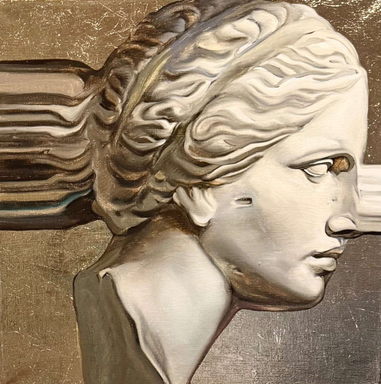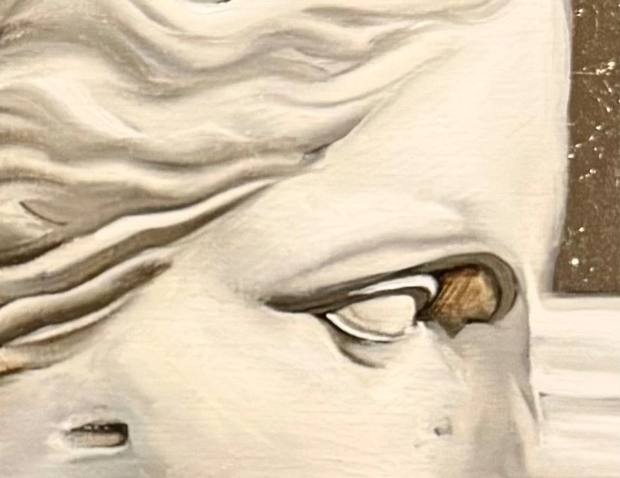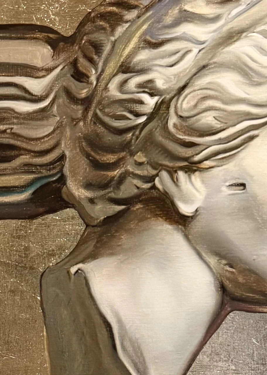 «Архетипы» материализуют идею Джеймса Хиллмана о том, что душа мира проявляется через его изменения. Классические головы со сколами — это не образы упадка, а свидетельства таких изменений, через которую архетип проникает в мир и способствует трансформации образа. Золотой фон здесь — не украшение, а поле имманентного — то, что Агамбен мог бы назвать «вечным присутствием», — на котором разворачивается драма взаимодействия между чистым абсолютом (золото) и её неизбежным воплощением в материи (мрамор).