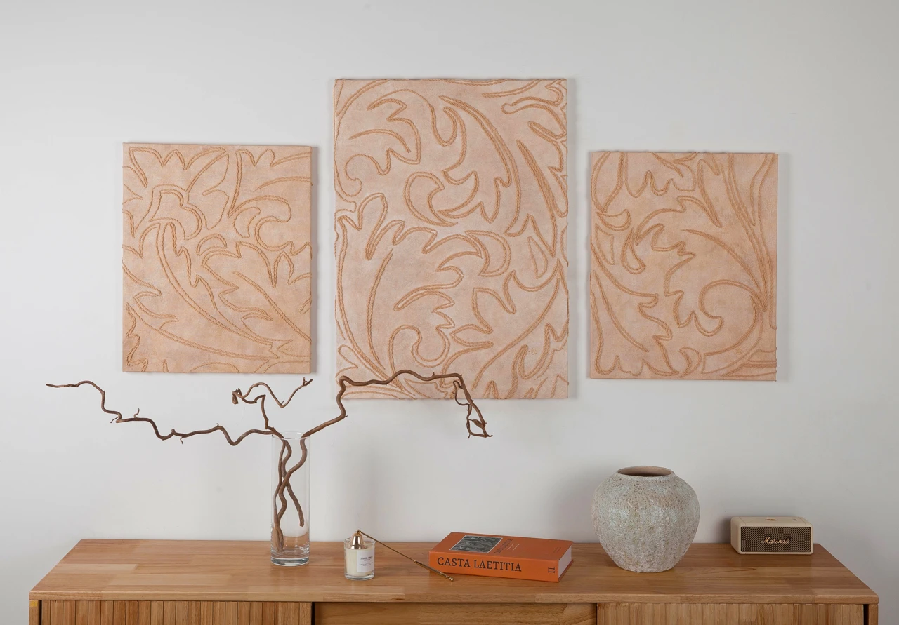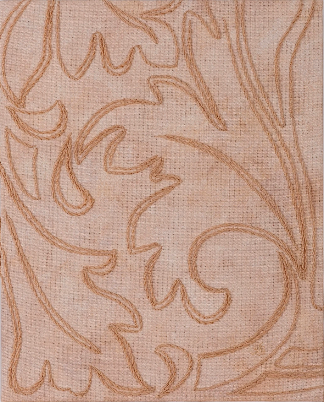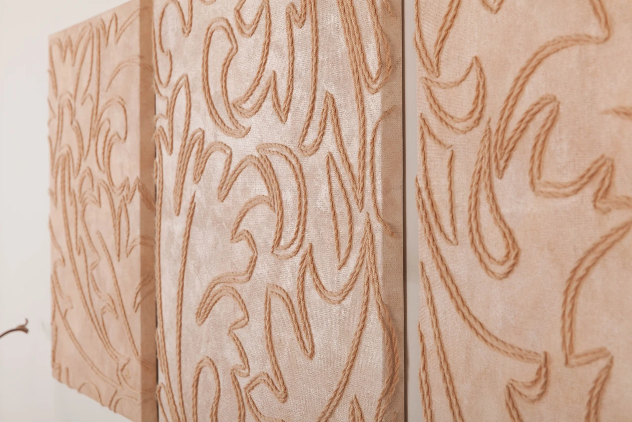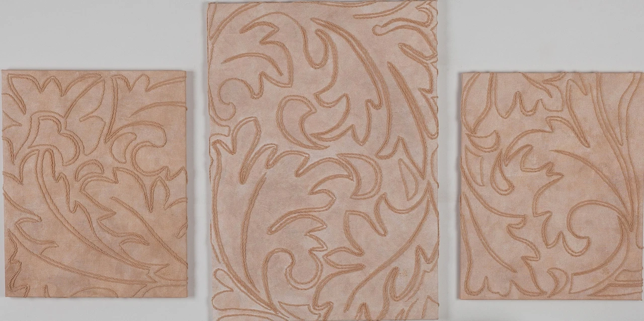 Растительный узор, состоящий из переплетающихся листьев аканта, одна цветовая гамма в тонировке холста и ниток объединяет три работы в единую композицию.