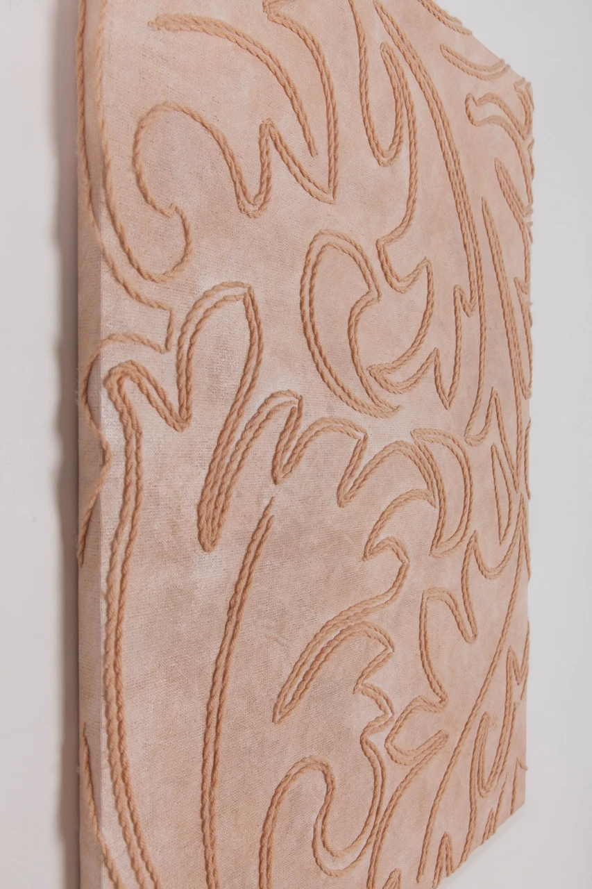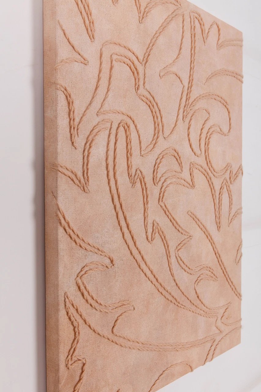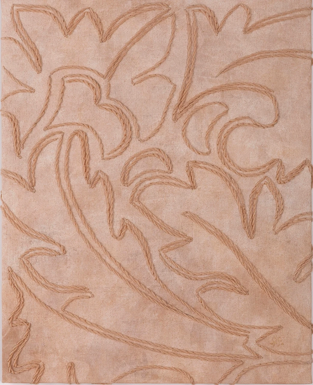 Растительный узор, состоящий из переплетающихся листьев аканта, одна цветовая гамма в тонировке холста и ниток объединяет три работы в единую композицию.
