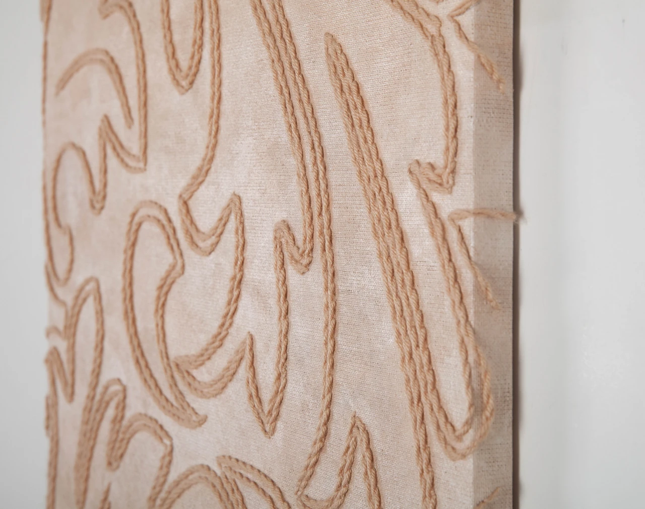 В тонировке холста использовались бежевато-коричневые оттенки, которые деликатно светятся при разном освещении бликами перламутра и золота. Цвет нитей золотисто-бежевый — это нюанс оттенков холста. Вышивка объемная за счет толщины и фактуры пряжи. Из декоративно-гладьевых стежков складывается непрерывный растительный орнамент легкий, лаконичный и динамичный.