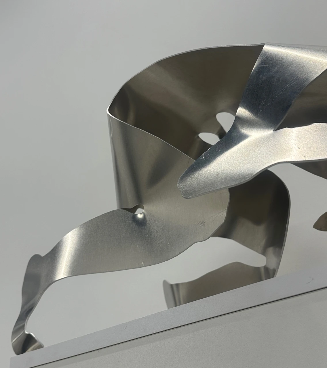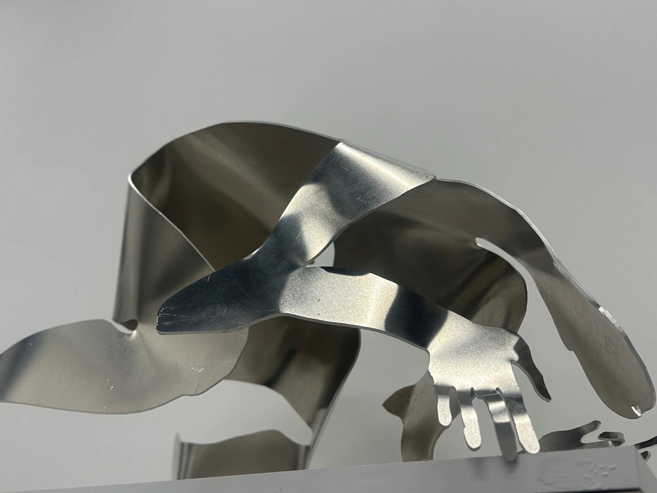 В серии скульптур «Море волнуется раз...!» Наташа Иванова сгибает выкроенные из металлического листа силуэты, что позволяет создать объём и игру света у скульптуры. Холодный плотный цвет алюминия, его звонкость формируют напряжённый воздух вокруг работы. Но в каждом пространстве скульптура ведёт себя по-своему, так как отражает свет и окружение.