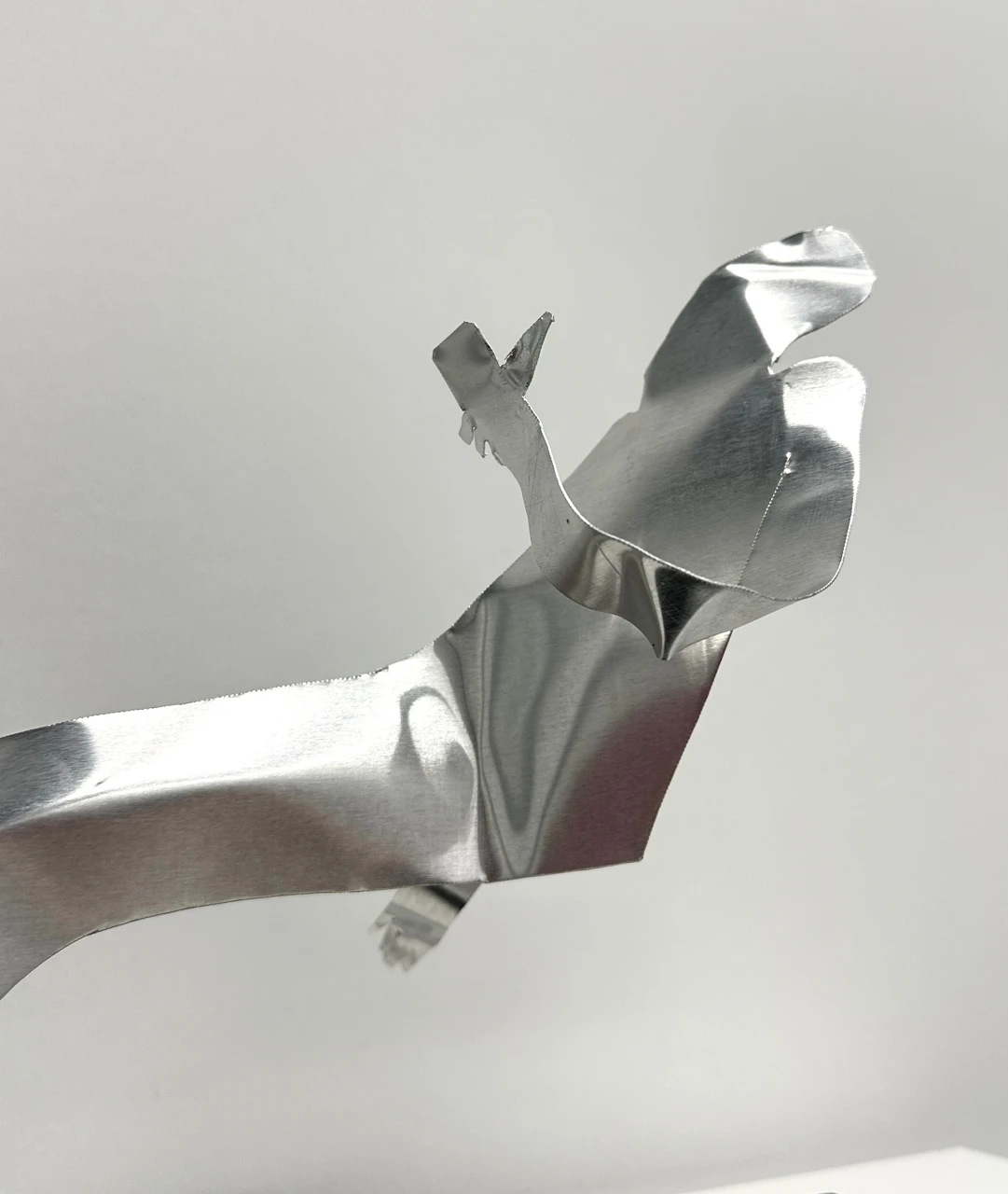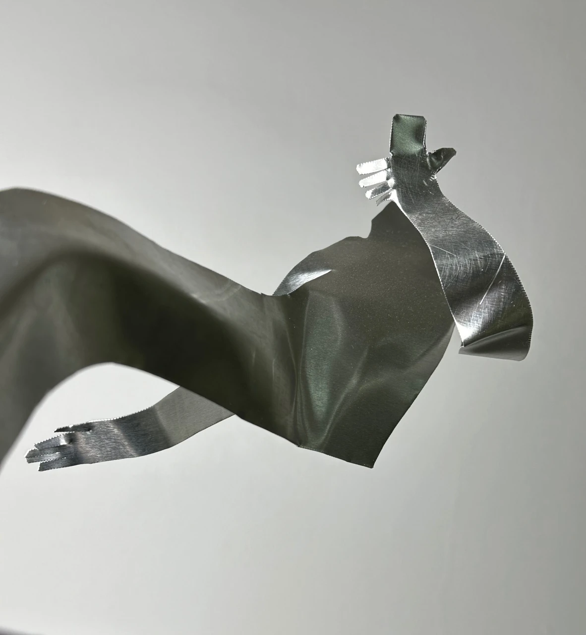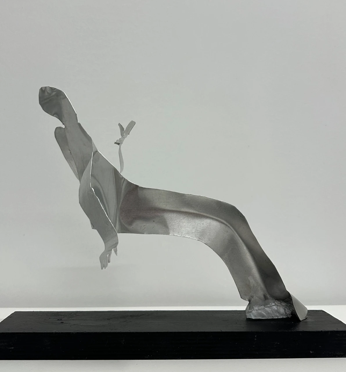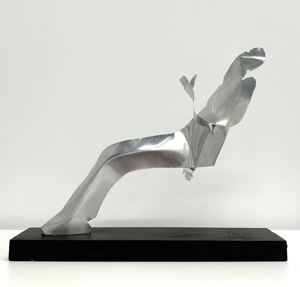 Серия «Ракурсы» включает в себя скульптуры созданные из листа алюминия. Мне интересно гнуть плоскость и получать из этого наполненный воздухом объем, который может работать с пространством. Образы в скульптурах данной серии рождены внезапно, пойманы с непривычных ракурсов, что делает фигуры людей искаженными и слегка пугающими.