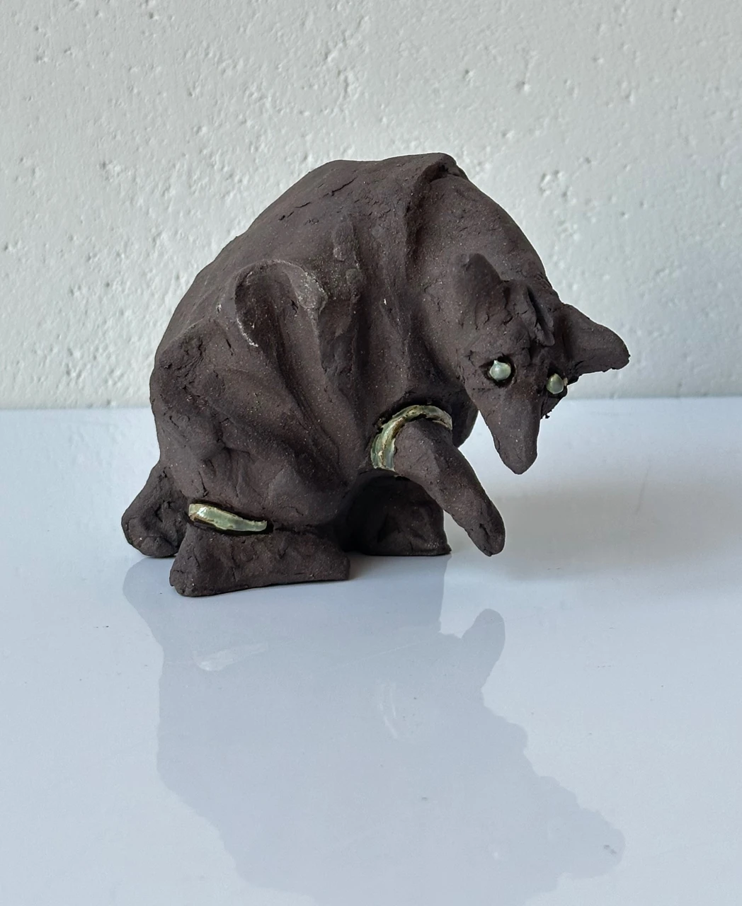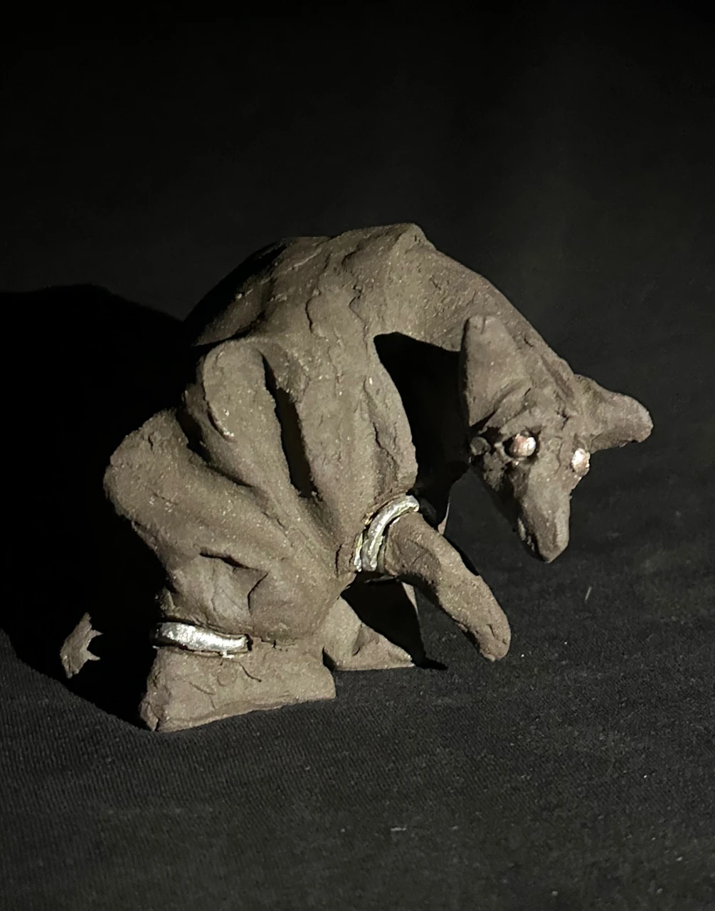 Скульптуры изображают испуганных собак, которые при виде фар от машин теряют ориентацию в пространстве, становятся пугливыми и даже смущенными. Мне показался интересным синтез черного грубого шамота и светоотражающей краски, как будто неосвоенная природа сталкивается с технической и искусственной стороной жизни человека в современном мире.