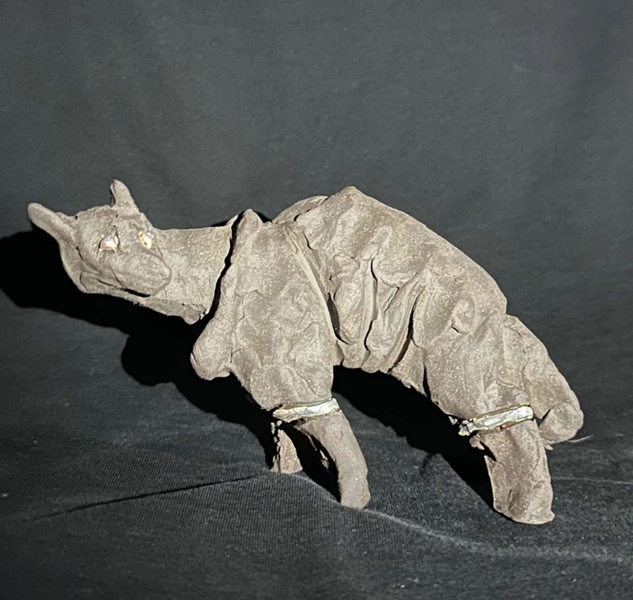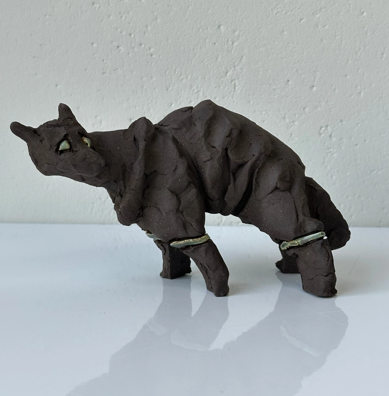 Скульптуры изображают испуганных собак, которые при виде фар от машин теряют ориентацию в пространстве, становятся пугливыми и даже смущенными. Мне показался интересным синтез черного грубого шамота и светоотражающей краски, как будто неосвоенная природа сталкивается с технической и искусственной стороной жизни человека в современном мире.