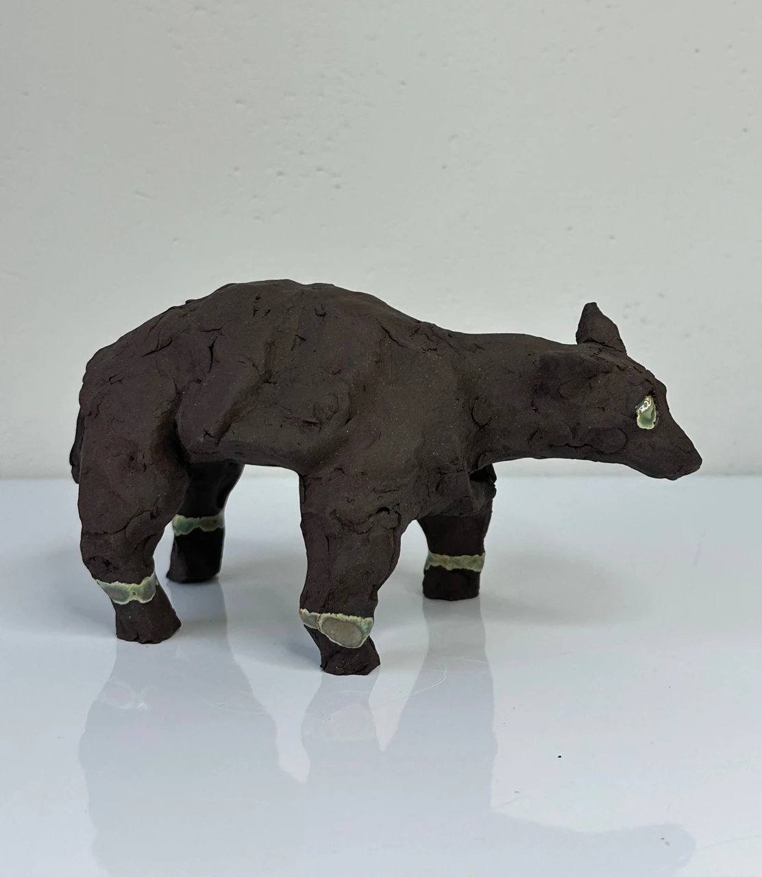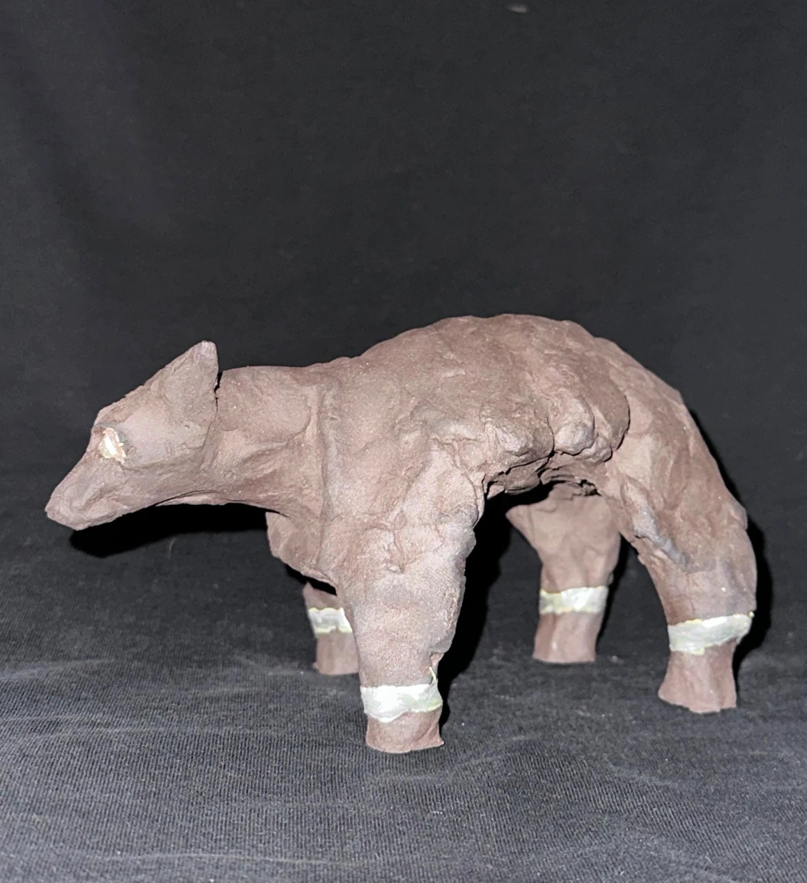 Скульптуры изображают испуганных собак, которые при виде фар от машин теряют ориентацию в пространстве, становятся пугливыми и даже смущенными. Мне показался интересным синтез черного грубого шамота и светоотражающей краски, как будто неосвоенная природа сталкивается с технической и искусственной стороной жизни человека в современном мире.