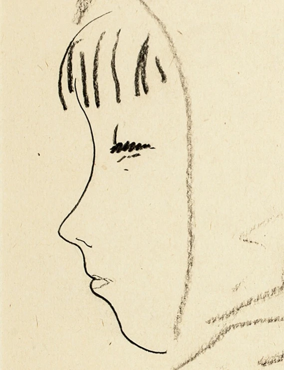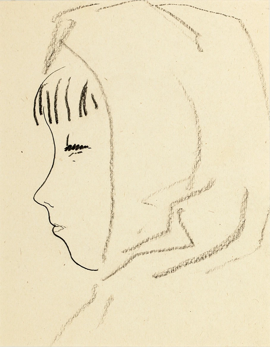 Угольный рисунок девочки в платке. Чёткий контур профиля, выразительная собранность. Удивительным образом, благодаря нескольким линиям, создаётся яркий харáктерный образ.