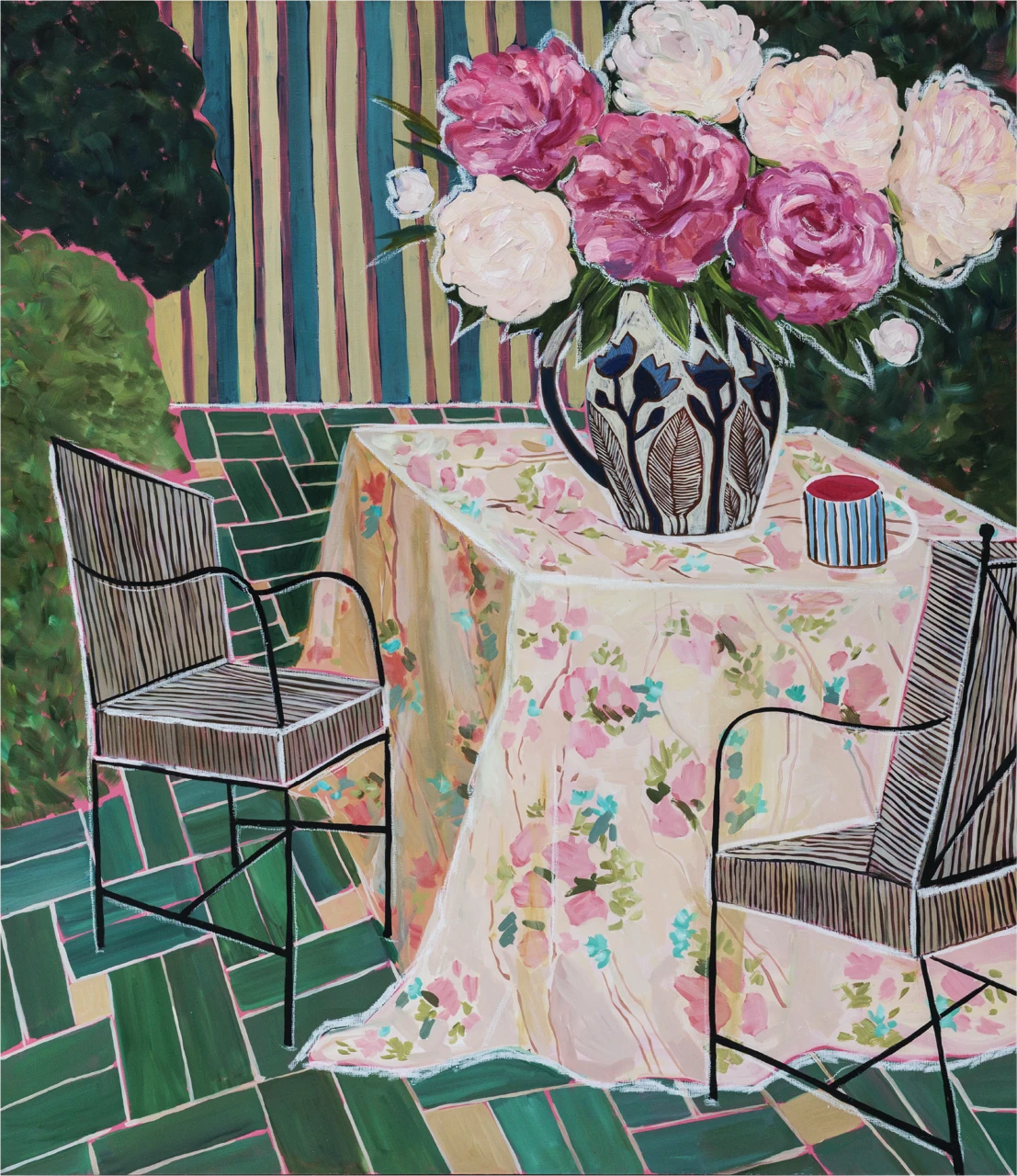 Герой этой картины уже появлялся ранее на других холстах, это цветок, который становится свидетелем активно разворачивающихся вокруг него событий, возможно поменяющих ход жизни участников. Никто его не замечает, и не придает значения его присутствию, а меж тем только он остается свидетелем жизненных ситуаций