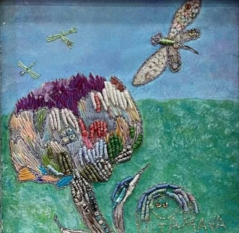 Работа выполнена в авторской технике живописи нитью, которая совмещает в себе опыт древних мастериц и современный подход к вышивке.