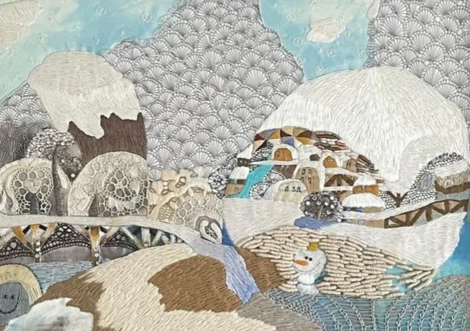 Работа выполнена в авторской технике живописи нитью, которая совмещает в себе опыт древних мастериц и современный подход к вышивке.