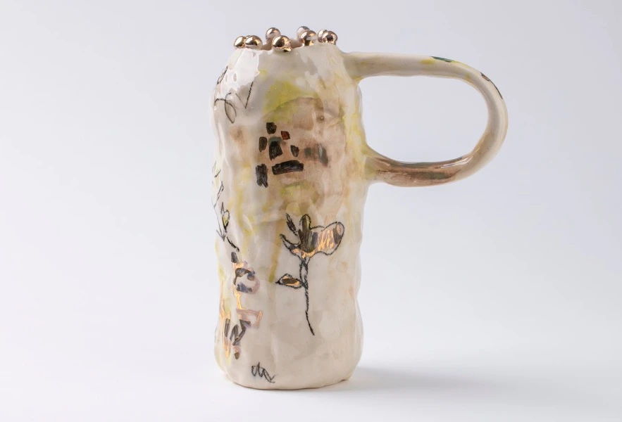 Керамическая ваза с ручкой, позолотой, акварельными разводами в желто-зеленой гамме и флоральными рисунками.