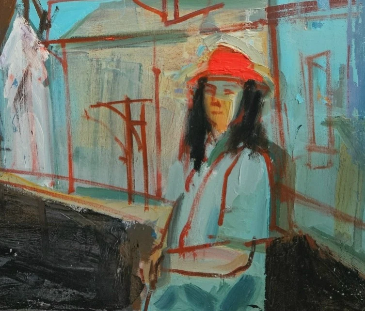 В работе «Девушка в красной панамке» художник экспрессивно передает динамику и характер города через контрасты цветов и работу с линией.