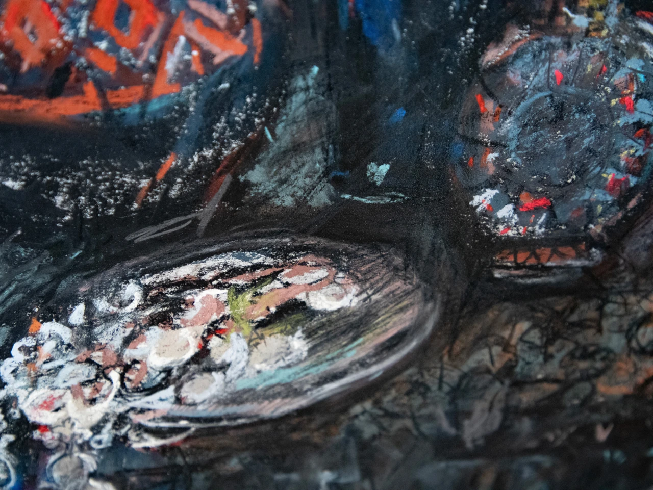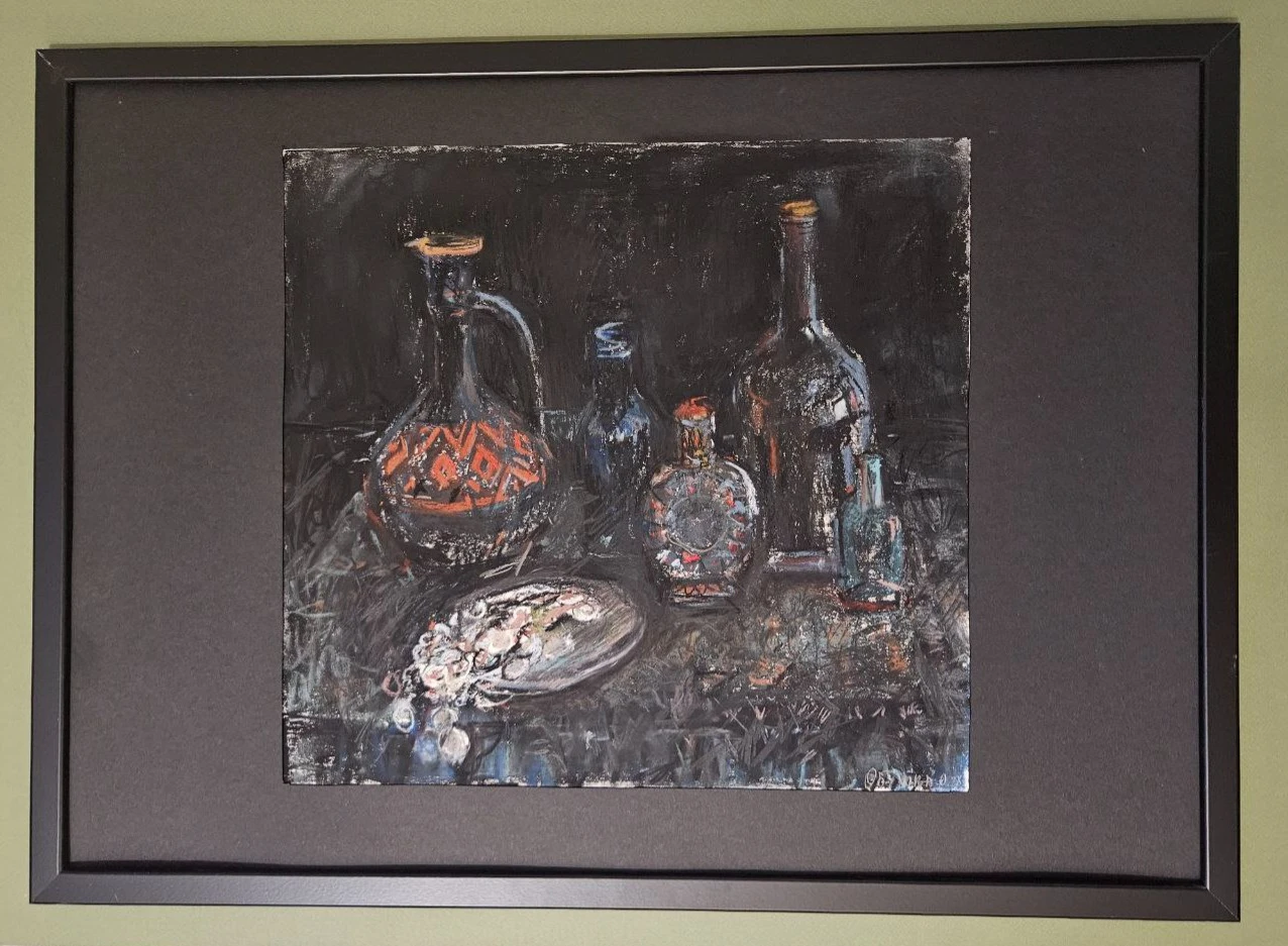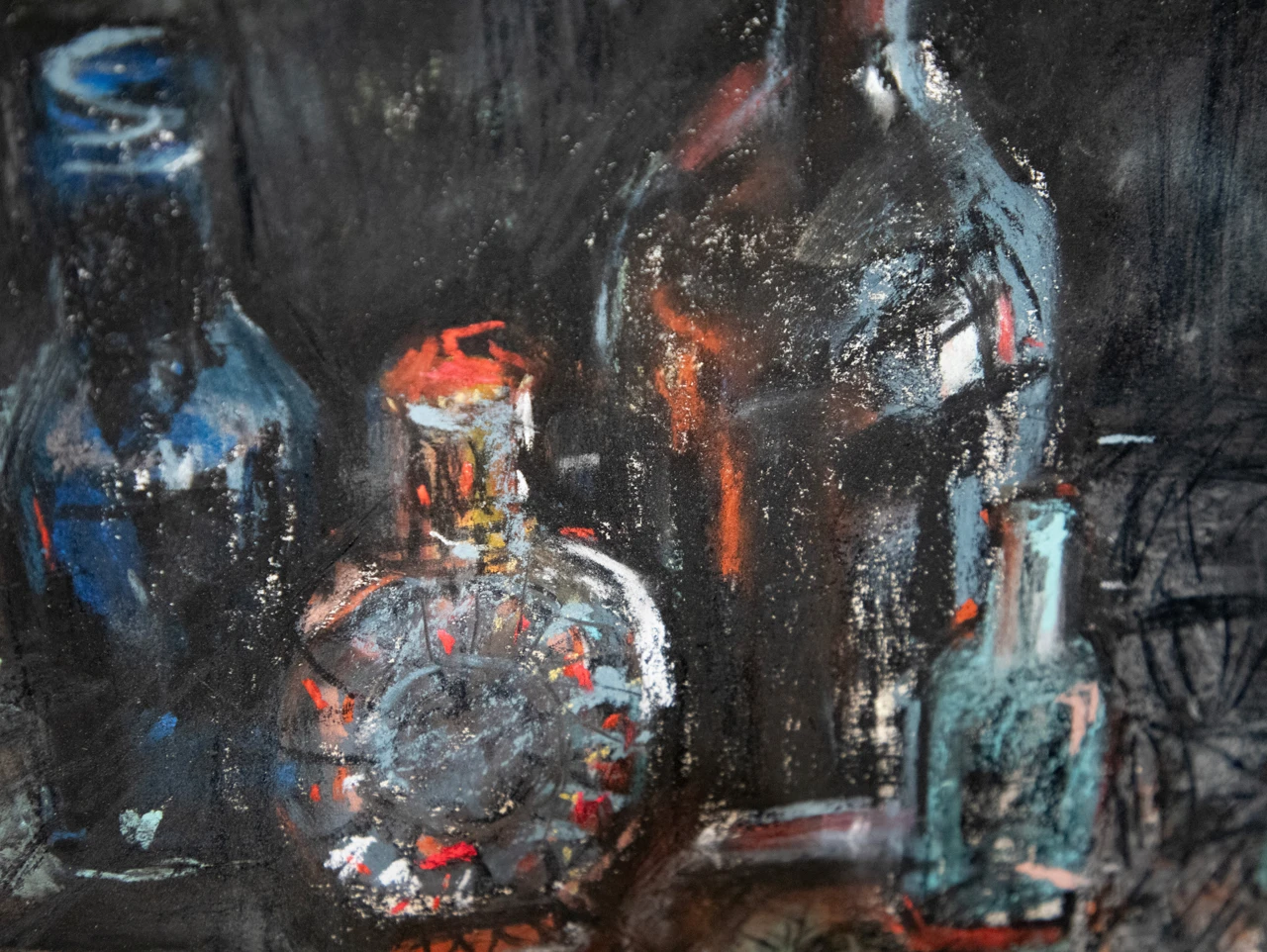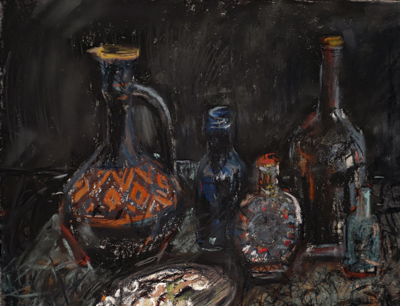 В работе «Натюрморт с духами и украшениями» художник передает сухой пастелью жизнь разнофактурных предметов в темных тонах: глиняного кувшина с ярким красным динамичным узором, блеск украшения на переднем плане, флакон духов с красной крышкой, блики от окна на стеклянной бутылке, узор гипюровой черной ткани.