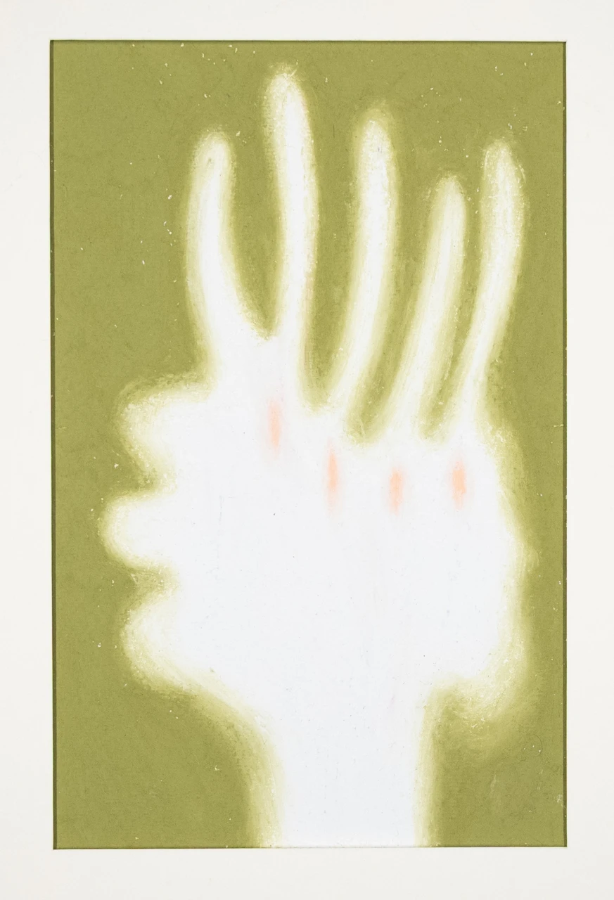 «Сомнения и догадки [2025]» — графическая работа из серии «Порталы», выполненная цветными карандашами и графитом на бумаге.