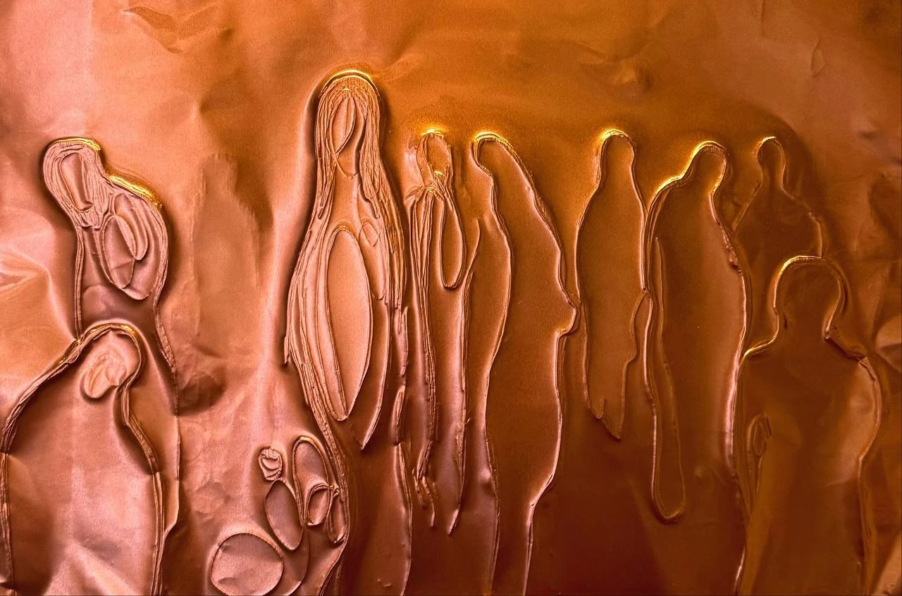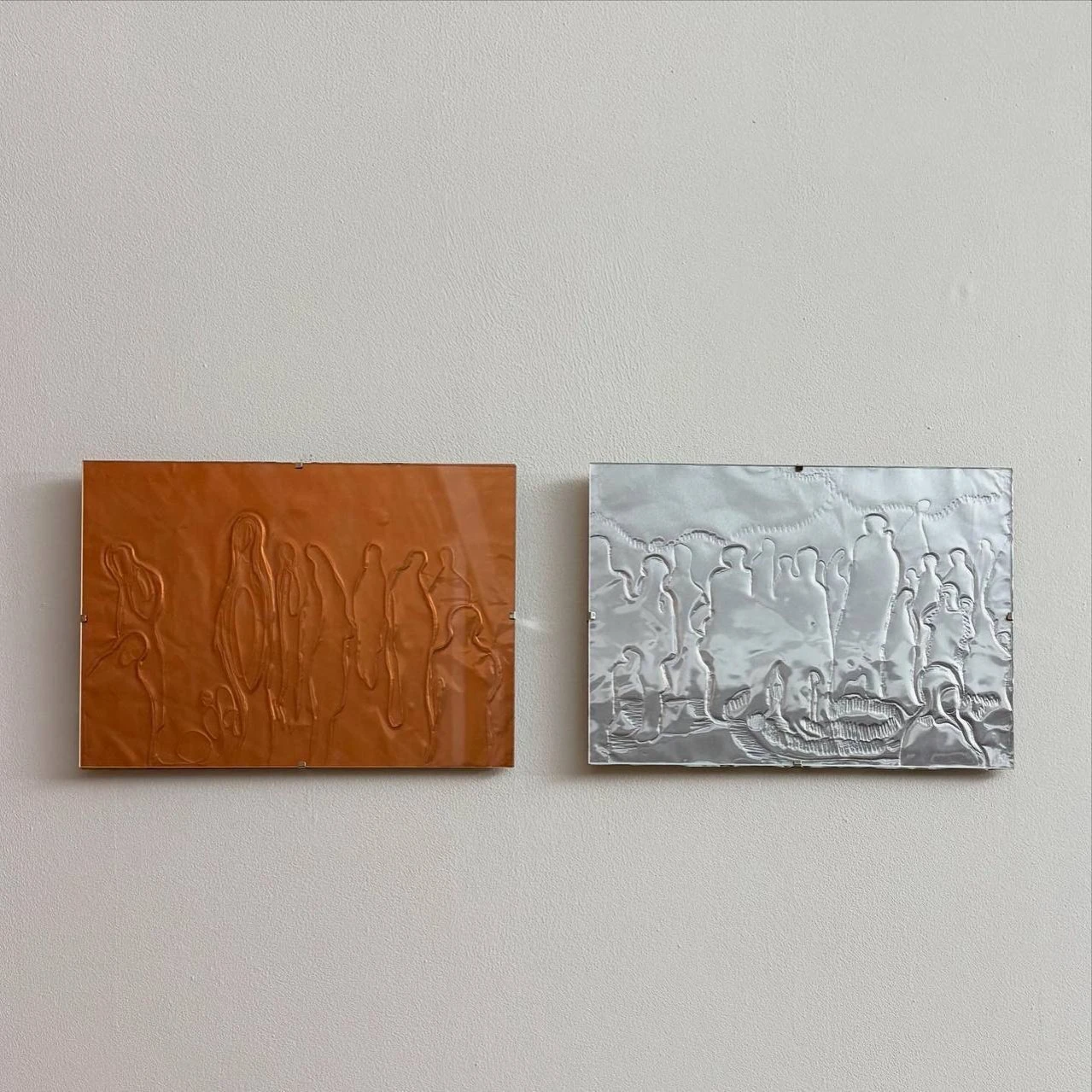 Серия "Рельефы" продолжает проект Племя Уранди. В данной серии открыла для себя фольгу и ее псевдоблестящую поверхность, мимикрирующую под дорогие металлы.