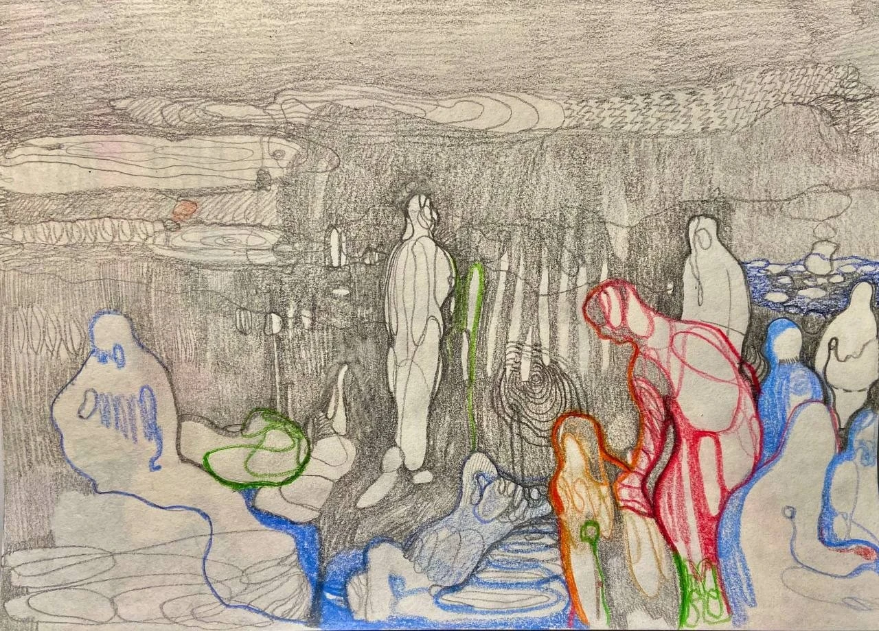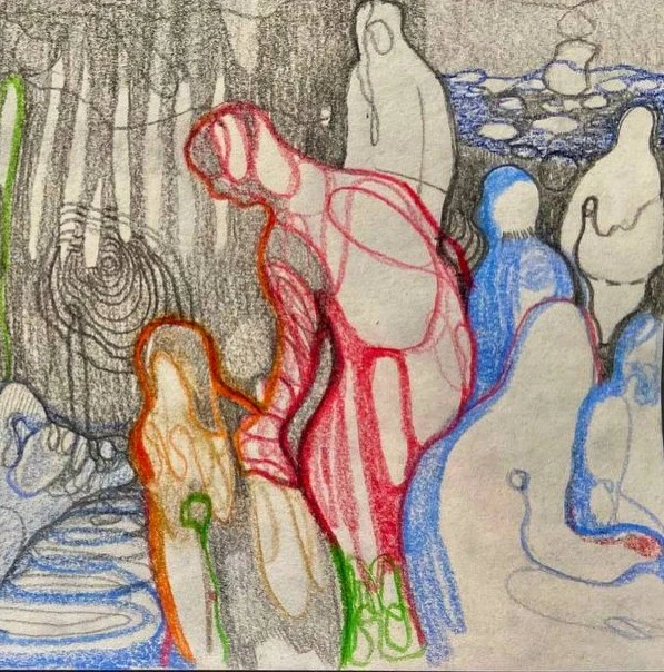 Работа из проекта племя уранди «Среди» продолжает серию работ на светлом фоне, выполненных цветным карандашом на бумаге. Серия данных работ образовалась в самом начале проекта и сформировалась в целый цикл.