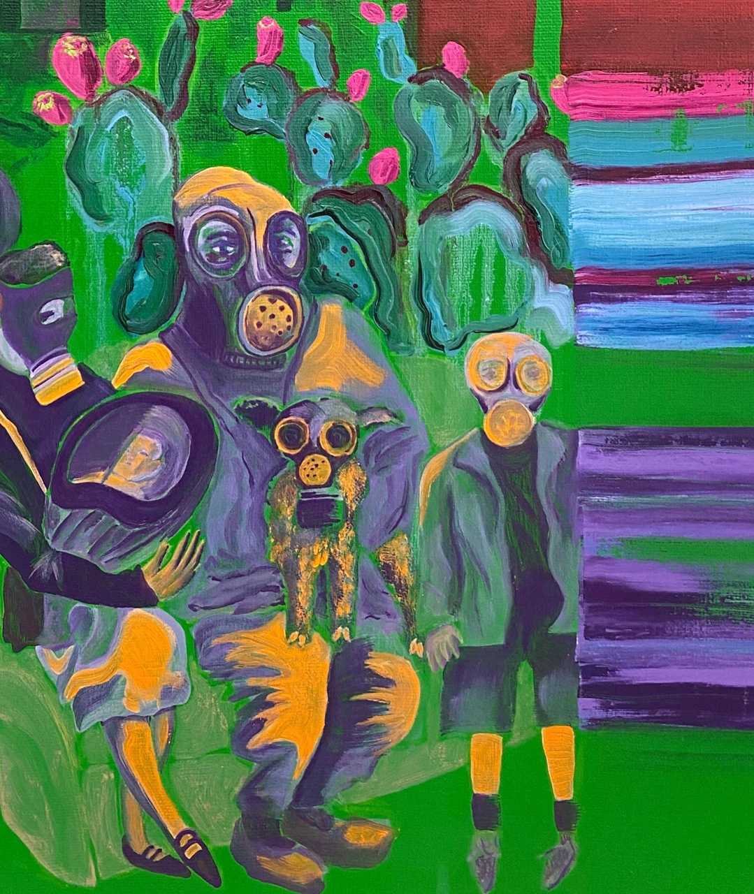 Эта серия из пяти холстов — визуальная притча об отчуждении и человечности в мире, который выбрал забвение. Яркий, но ядовитый мир представляет общество, добровольно надевшее маски конформизма, чтобы существовать в комфортной рутине.