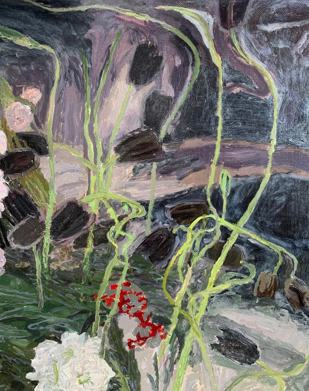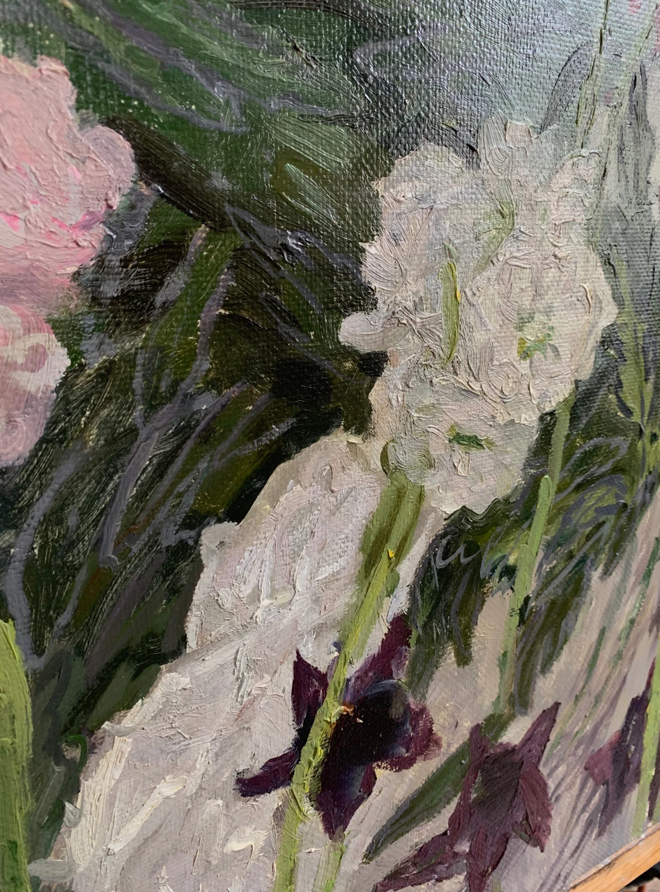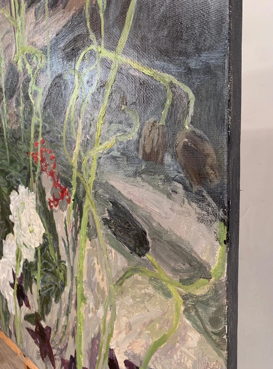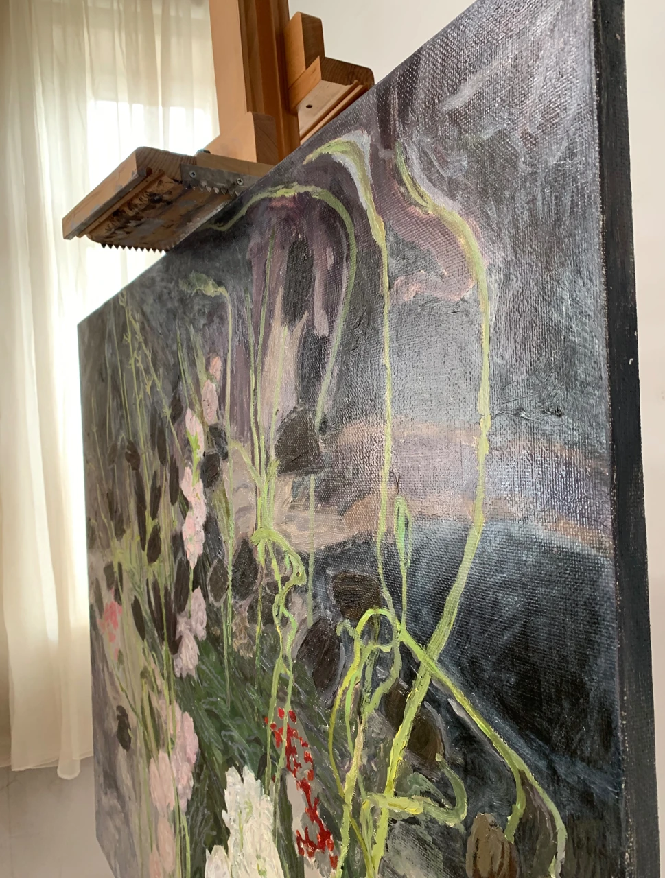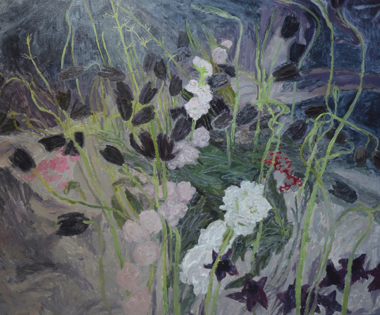 Горизонтальная композиция, построенная на ритме цветовых сочетаний. Фон то растворяется, то уплотняется вокруг растений, усиливая ощущение движения. Линии стеблей тянутся, пересекаются по всей плоскости холста. Они, как живописные нити, соединяют между собой бутоны, лепестки, формы, намеки-уводя наш взгляд ввысь — за поверхность холста.