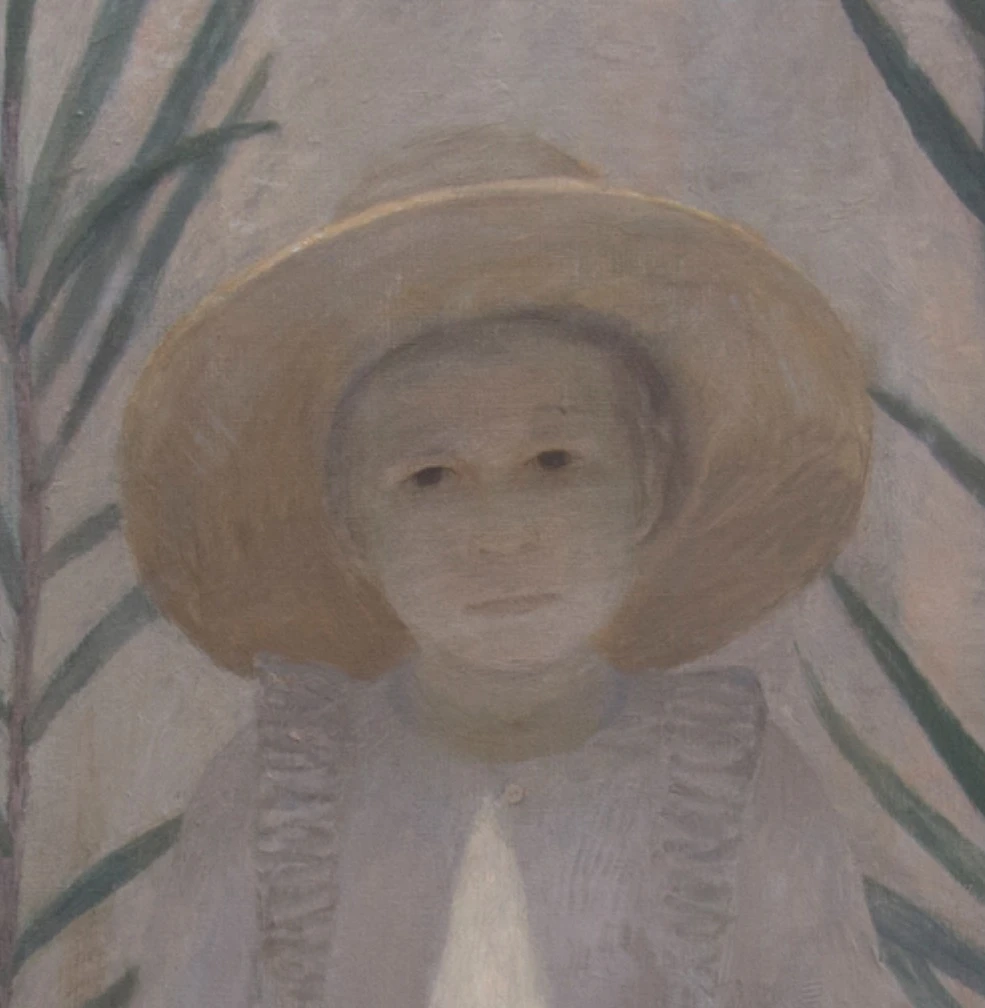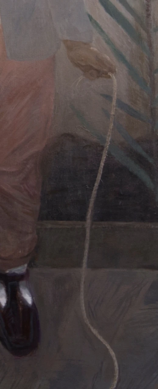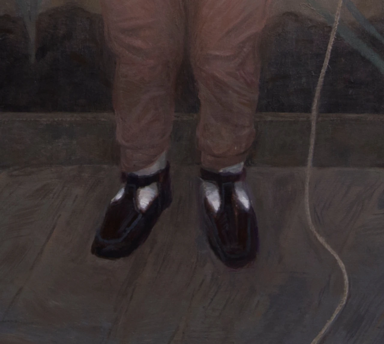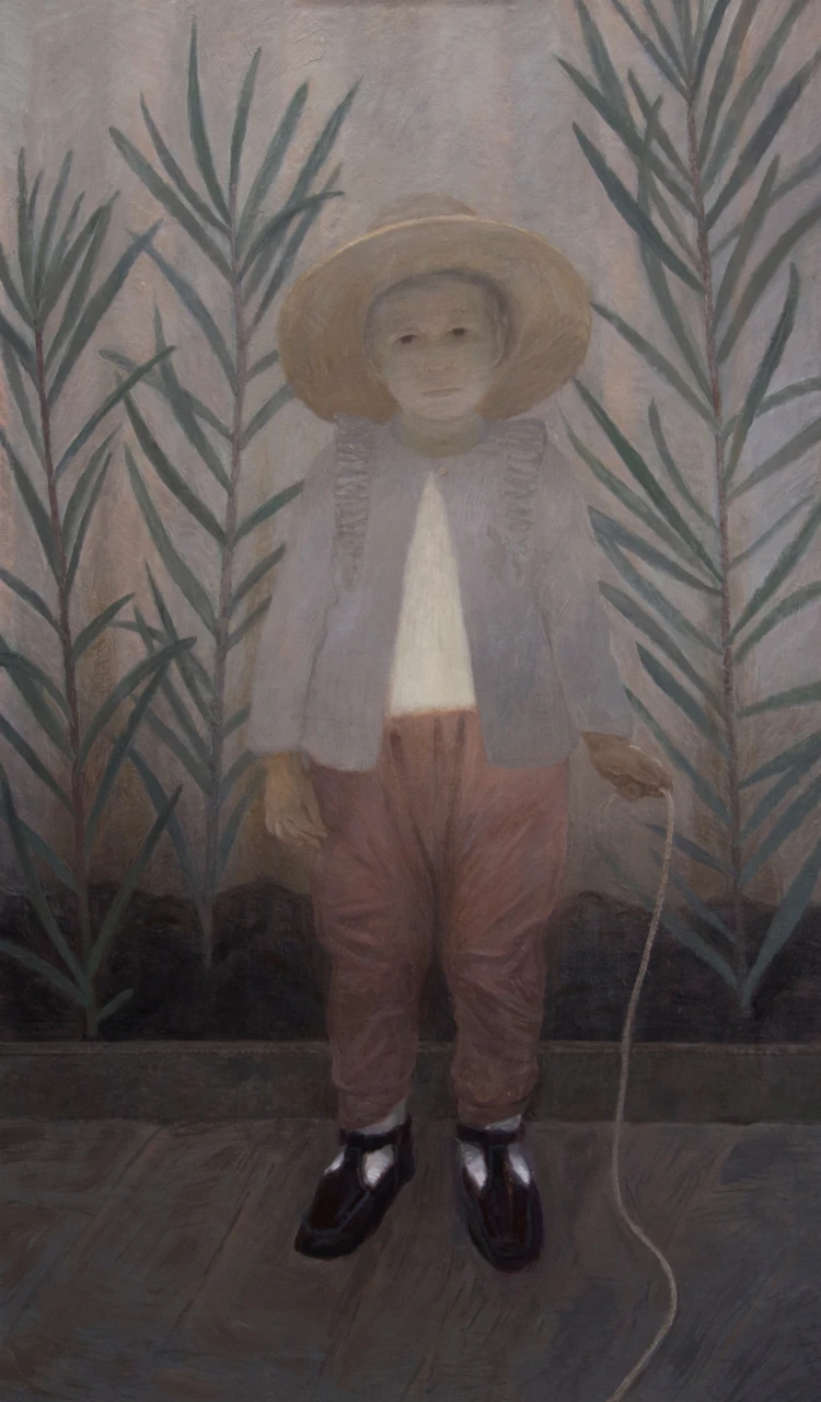 В руке у ребенка веревочка, которая уходит за пределы картины. У кого-то веревочка разорвана, у кого-то крепкая. Я оставляю этот символ свободным для интерпретации. Что там? Связь с миром детства или загадка, доступная только душе ребенка?
