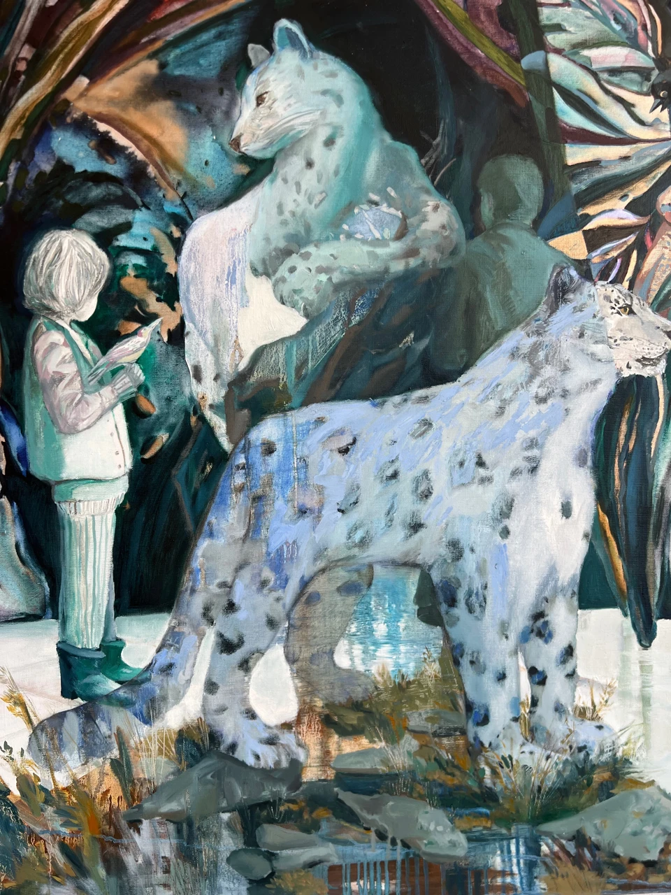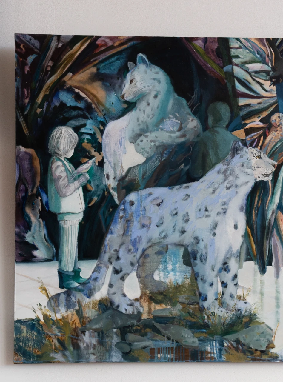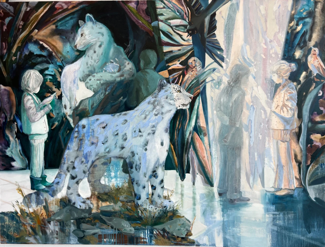 Работа «Экскурсия» — это авторская живопись, изображающая сцену, наполненную таинственностью и погружением в иной мир. Центральное место занимают две фигуры снежных барсов, выполненные в узнаваемой манере с акцентом на их пятнистый окрас и грациозные позы. Одна из фигур барса находится ближе к зрителю, детально прорисована, в то время как вторая, расположенная позади, выглядит более монументально и обобщенно. На заднем плане видны силуэты людей, окутанные мягким светом, создающим ощущение присутствия и одновременно отдаленности. Композиция построена на контрасте между четкостью переднего плана и размытостью фона, что придает работе глубину и многослойность. Колористическая гамма работы преимущественно состоит из холодных синих, бирюзовых и серых оттенков, с вкраплениями теплых тонов, создающих гармоничный, но интригующий визуальный ряд. Эта авторская работа станет выразительным арт-объектом для интерьера, добавив пространству атмосферу загадочности и утонченности.
