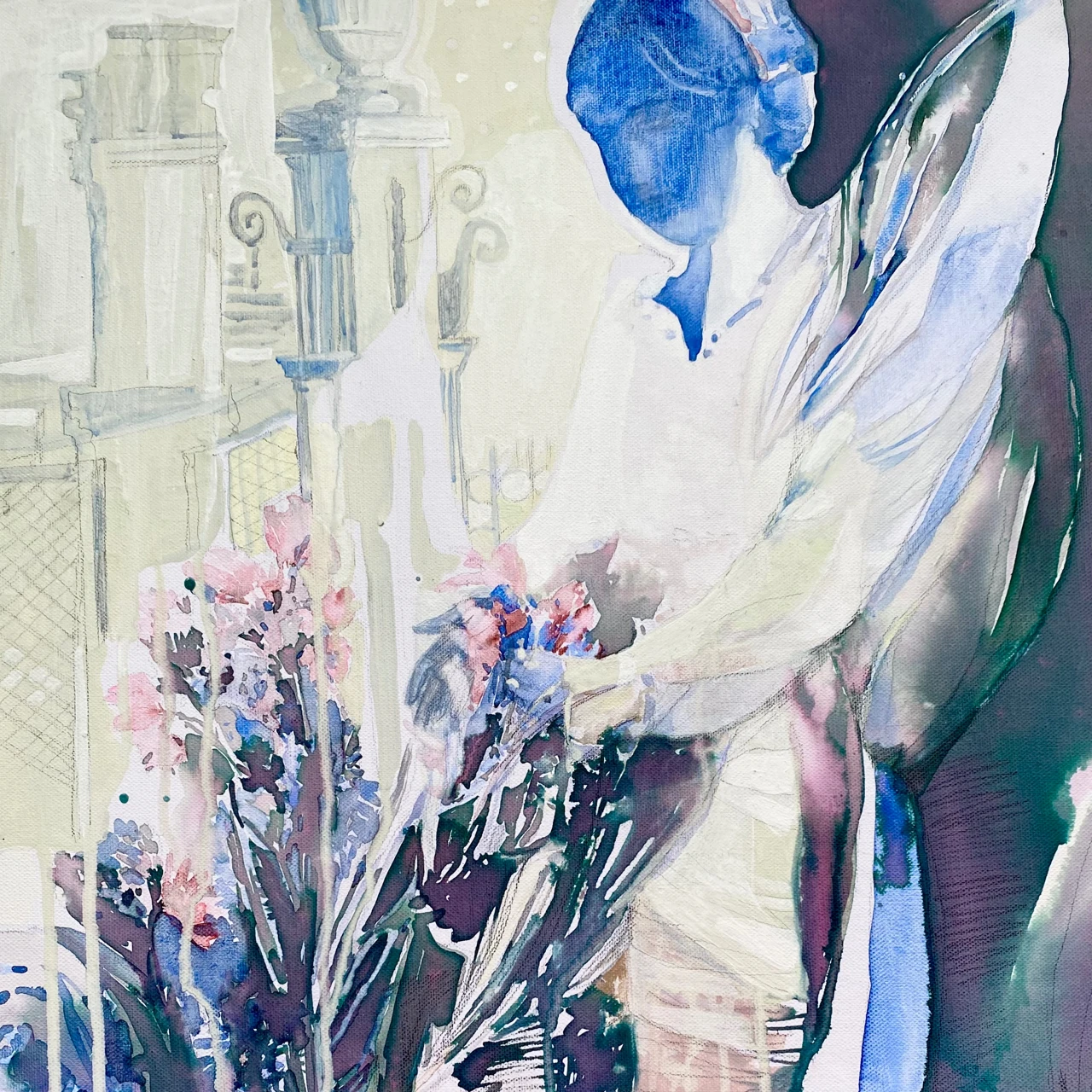 Работа написала на хлопковом холсте на галерейном подрамнике ( толщина 38мм) акрилом и акварелью. Картина полностью покрыта акриловым лаком доя защиты красочного слоя. Торцы работы закрашены, что позволяет экспонировать ее без рамы.