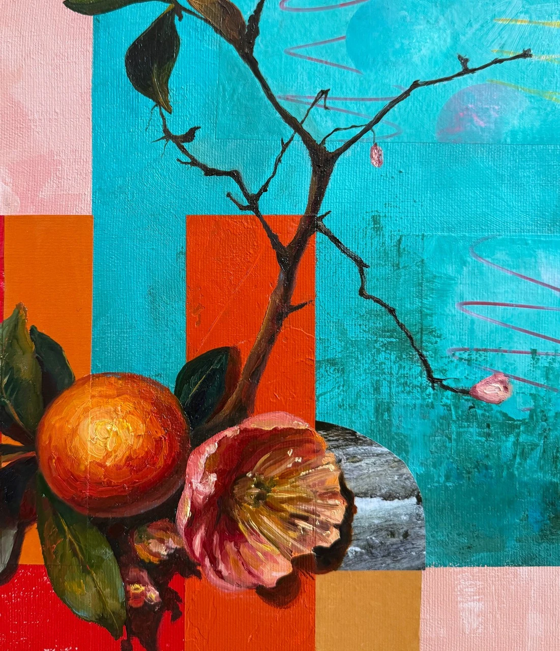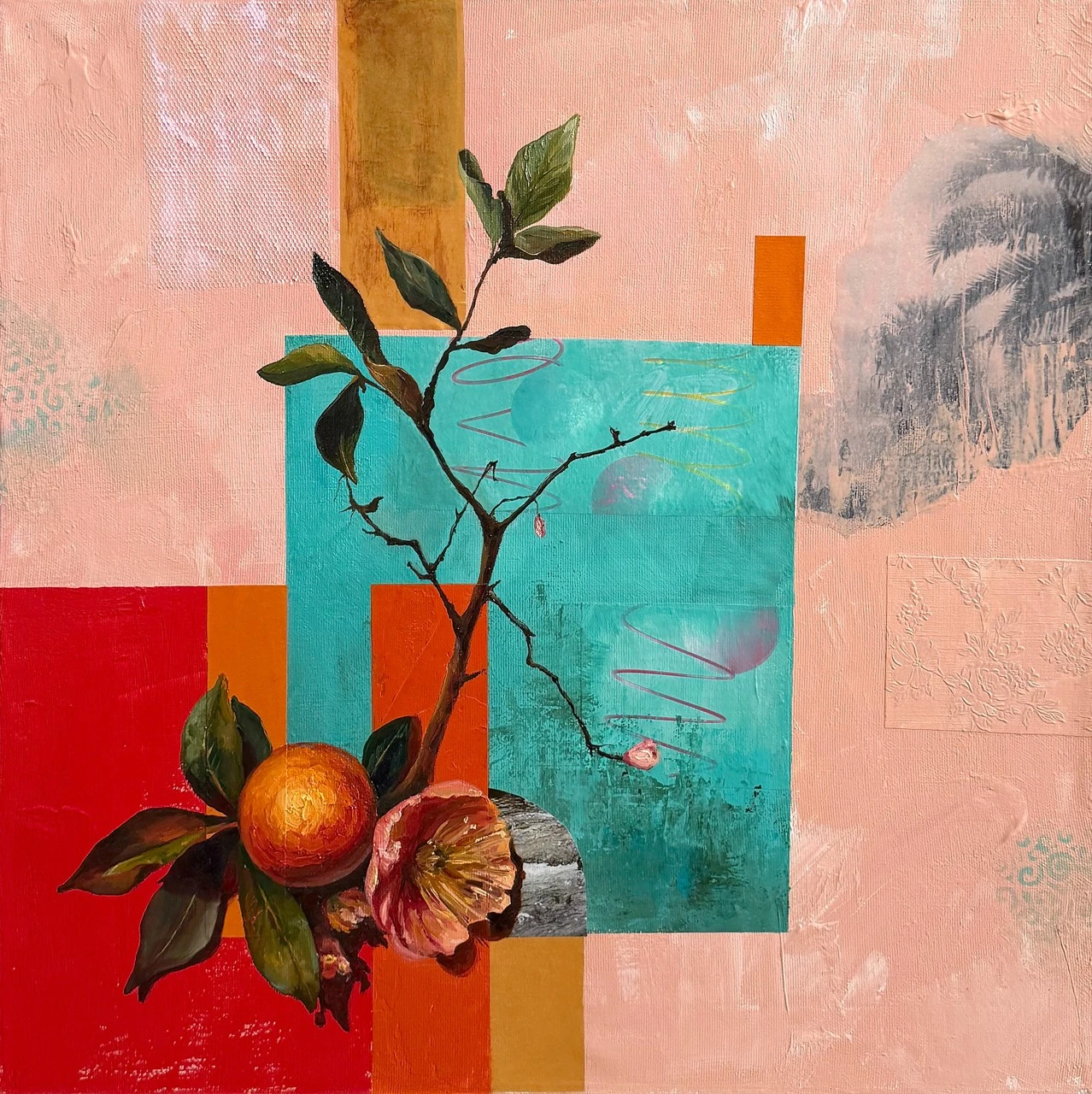 В этой работе я размышляю над тем, как важно фокусироваться на настоящем моменте. Коллажные и ассамбляжные элементы становятся метафорами растворяющихся воспоминаний: фрагменты прошлого, обрывки образов и следы давно прожитых эмоций как будто теряются в пространстве, исчезая подобно снам. Эти элементы не случайны — они несут в себе опыт, но уже не имеют власти над настоящим. На фоне этой зыбкой памяти появляется живопись — живая, яркая, уверенная. Веточка с плодом и цветком проступает как знак присутствия, напоминание о том, что жизнь продолжается здесь и сейчас. Каждый новый день приносит свежие плоды, и нет смысла цепляться за то, что уже ушло. Это не отказ от прошлого, а выбор — быть в моменте, проживать его осознанно, не уплывая в мечты и сожаления. Работа становится размышлением о том, как важно не теряться в воспоминаниях и фантазиях, а замечать и принимать жизнь во всей её полноте — даже в самых простых проявлениях.