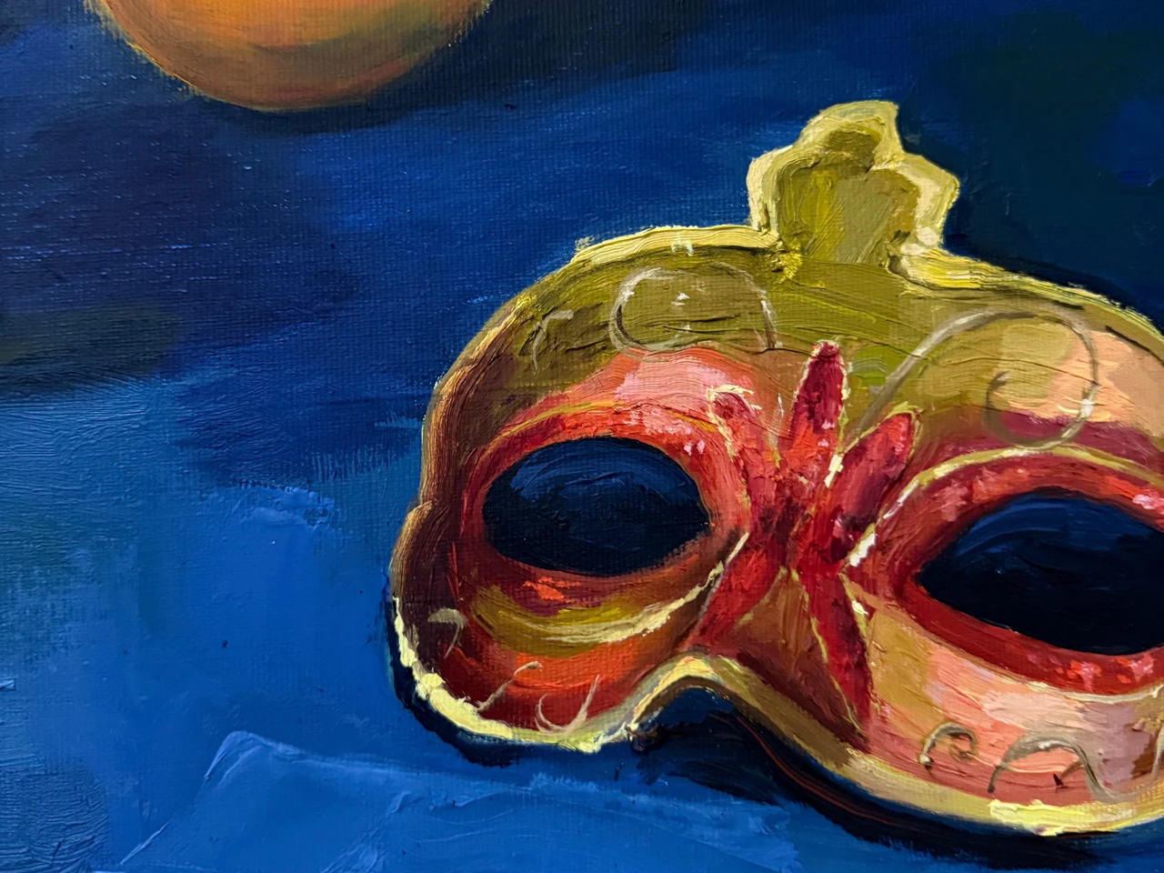 Золотая маска, лежащая в центре этой сцены, напоминает о том, что новогодняя ночь — это время, когда реальность смешивается с мечтами. Это ночь, когда возможно всё: загадываются желания, раскрываются тайны, а в воздухе витает чувство начала новой главы.