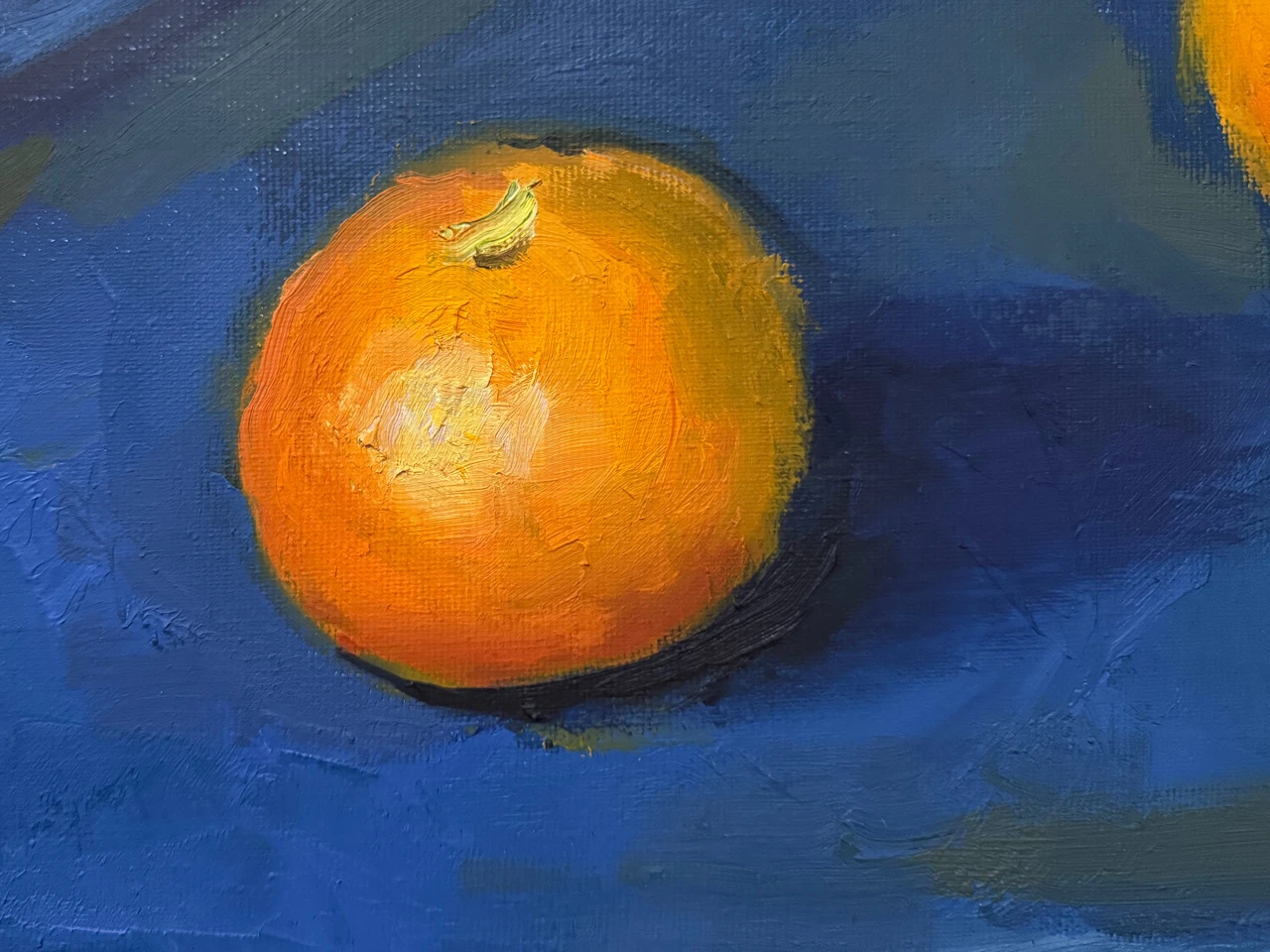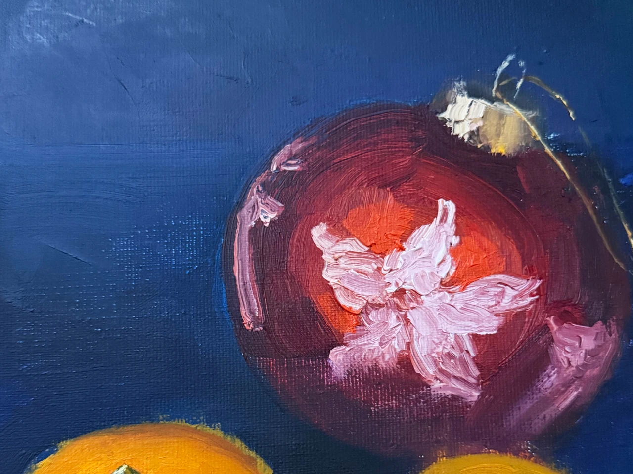 Картина переносит нас в загадочную атмосферу новогодней ночи, когда воздух наполнен предчувствием волшебства и маленьких чудес. Ананас, мандарины, елочная игрушка — это не просто предметы натюрморта, а символы праздничного изобилия, тёплых воспоминаний и ожидания чего-то нового.