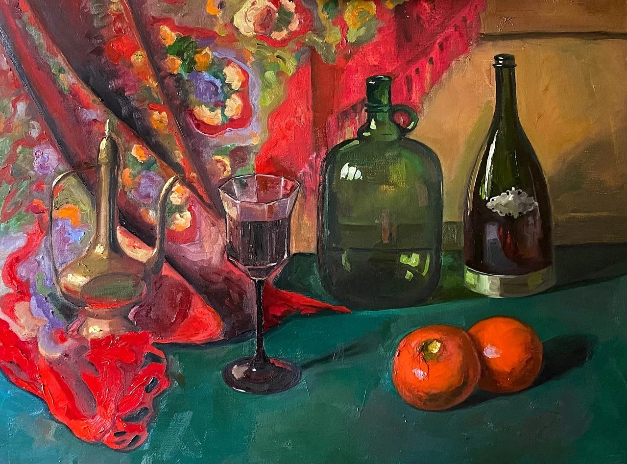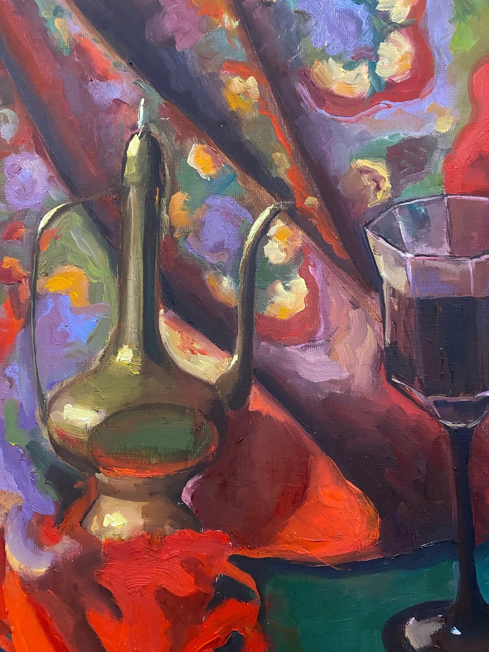 Натюрморт рассказывает о слиянии Востока и Запада. Эта встреча рождает удивительный синтез, наполняющий пространство гармонией и многогранностью. Взаимодействие культур создает уникальный калейдоскоп идей и чувств, где каждая деталь играет свою роль. Восточные мудрости, насыщенные символикой и духовными практиками, переплетаются с западными концепциями рационализма и индивидуализма, формируя более полную картину человеческого опыта.