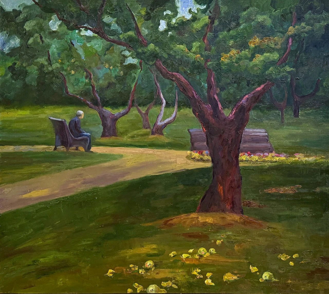 Парк Коломенское застыл в самом начале осени — момент, когда природа находится в состоянии хрупкого равновесия. В еще теплый день, наполненный сладким ароматом падающих яблок, время будто замедлило свой ход, позволяя проникнуться атмосферой ускользающей красоты. В центре сцены — пожилой мужчина, одиноко сидящий на скамье среди деревьев, чьи ветви уже предвещают грядущее опадение листвы.