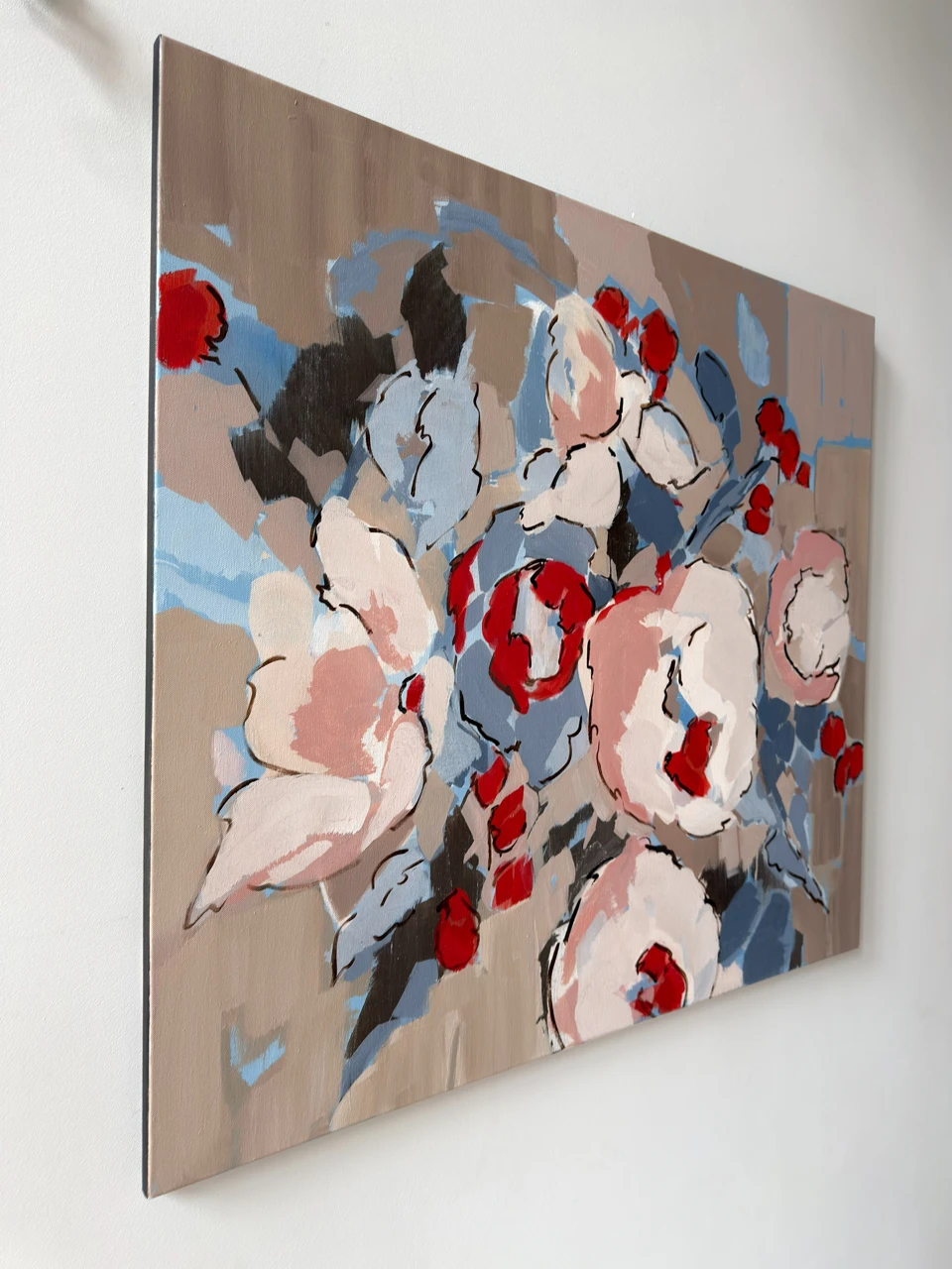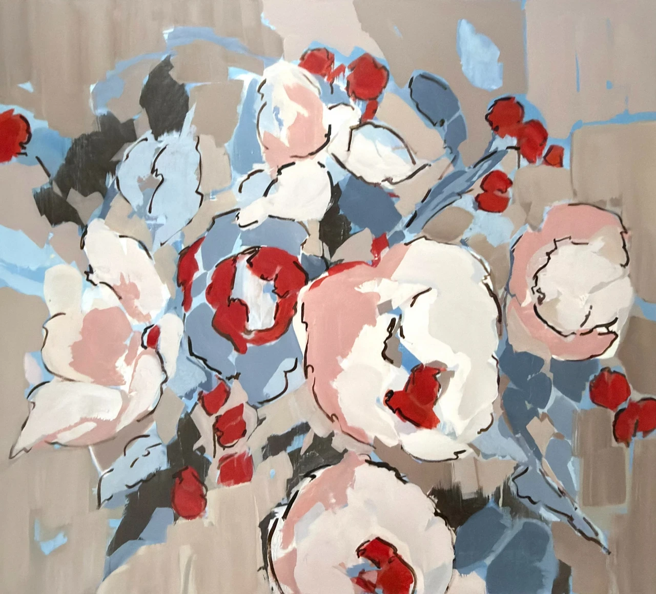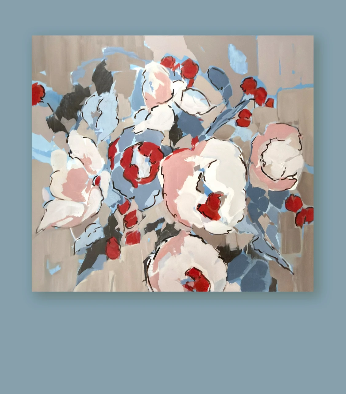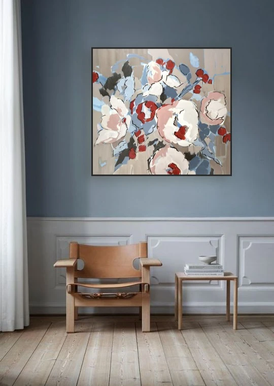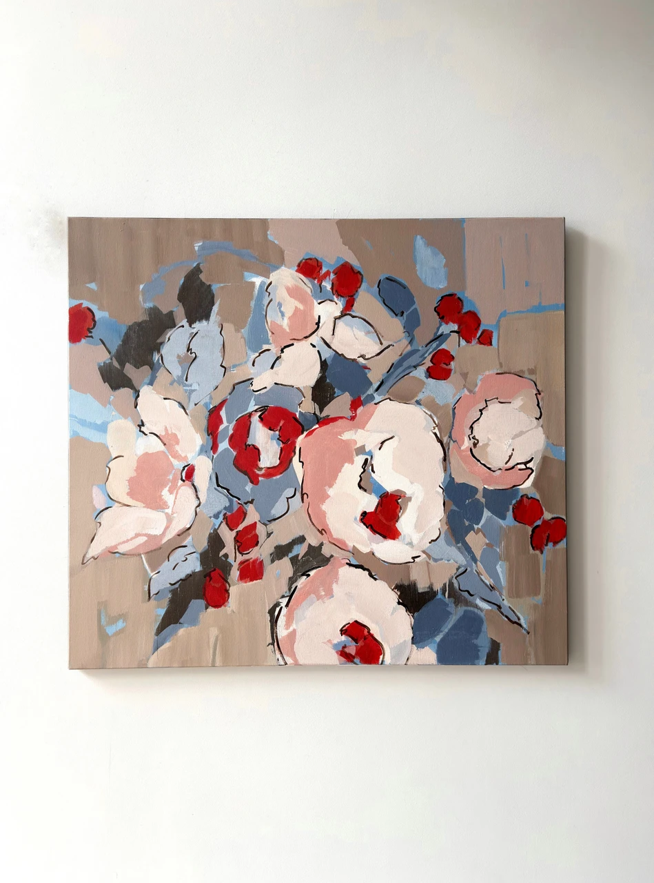 Работа «Разбитое цветение» — это масштабная интерьерная живопись, представляющая собой деконструированный флоральный сюжет. Композиция строится на сочетании крупных пастозных мазков и графичных контуров, которые формируют очертания пышных бутонов. Авторская работа выполнена в гармоничной палитре, где доминируют припыленные серо-бежевые и небесно-голубые оттенки, контрастирующие с экспрессивными акцентами алого и глубокого синего цвета. Динамичный ритм мазков акрила создает ощущение вибрации и изменчивости природной формы. Художественное решение полотна базируется на балансе между фигуративностью и абстракцией, где название подчеркивает фрагментарность и хрупкость запечатленного момента. Использование акриловых красок позволяет добиться многослойности и богатой фактуры, подчеркивающей современный характер произведения. Данное современное искусство станет выразительным арт-объектом для интерьера, привнося в пространство эстетику интеллектуального минимализма, и гармонично дополнит частную коллекцию живописи.