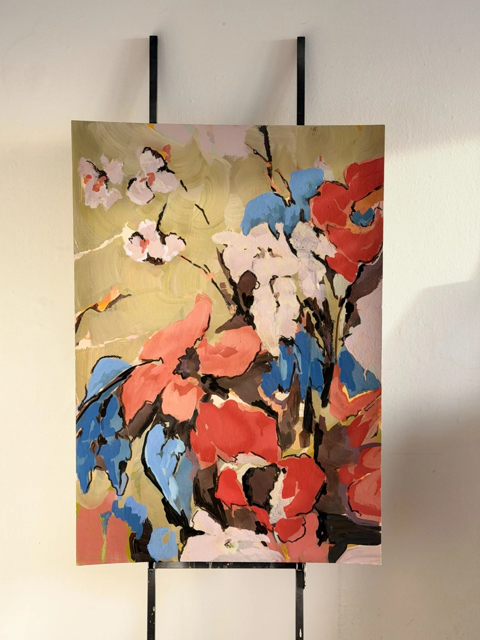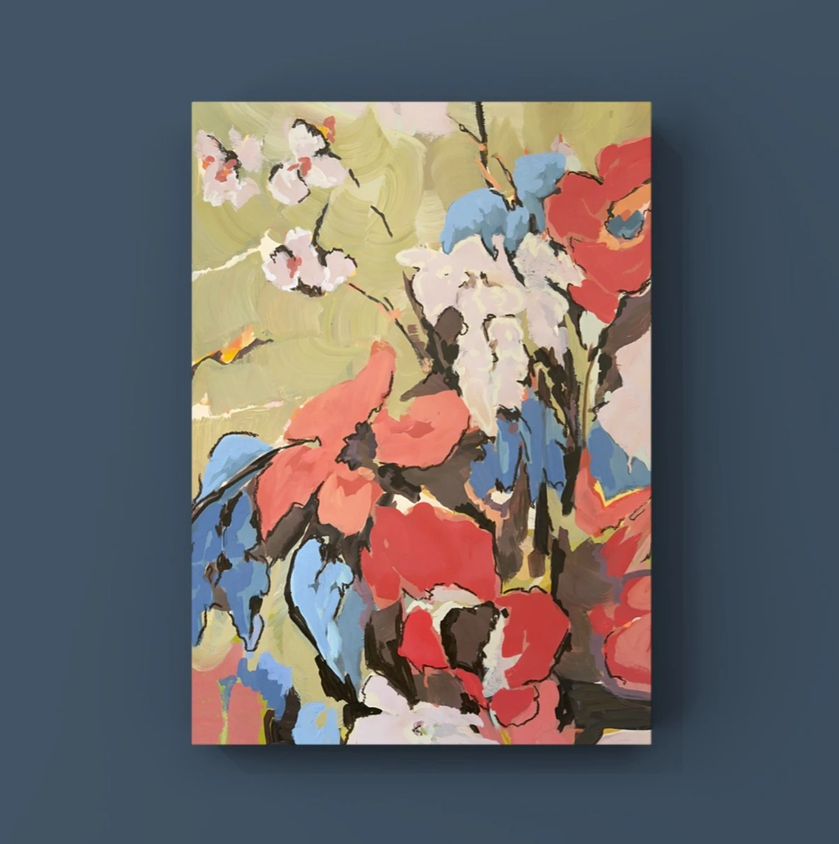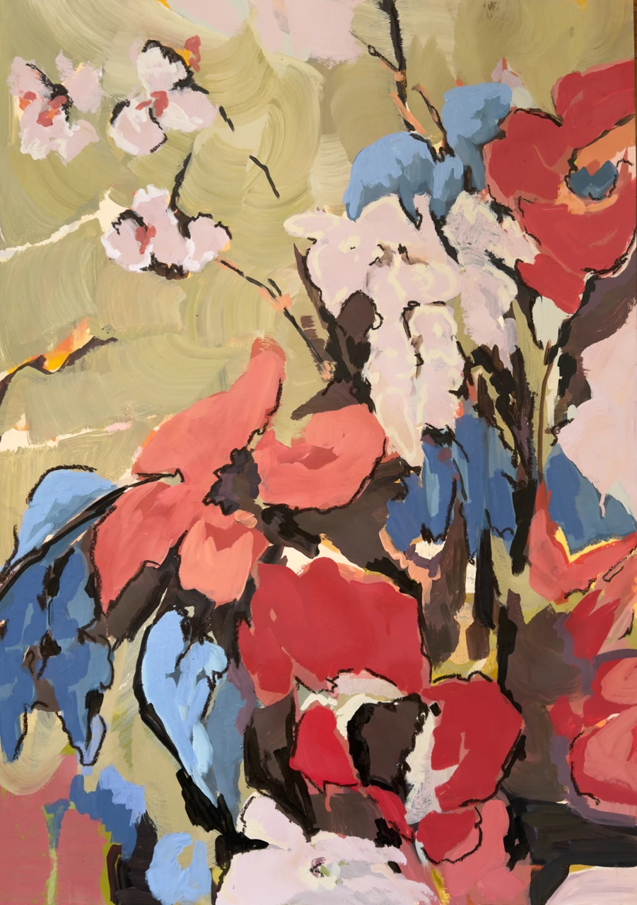 Композиция построена на взаимодействии крупных цветовых форм, напоминающих абстрактные цветы или лепестки. Отсутствие четких контуров и размытые края усиливают ощущение движения и спонтанности. Эта авторская работа, выполненная в технике графики, станет выразительным арт-объектом для интерьера, добавляя пространству энергии и колорита.