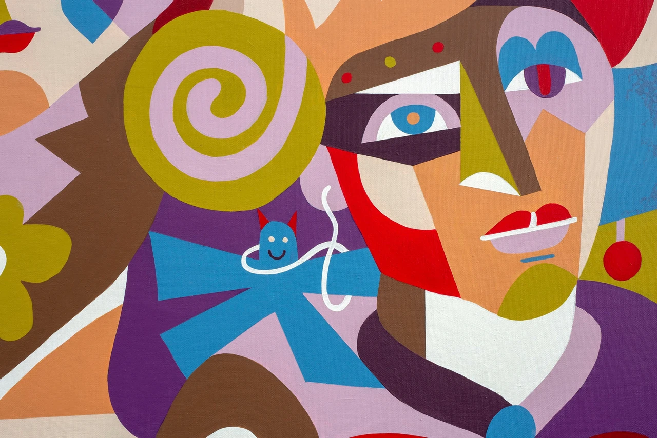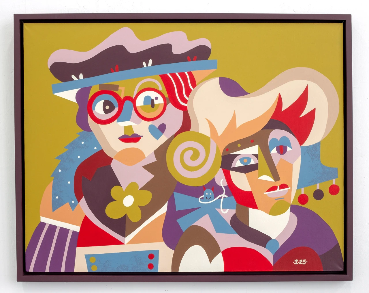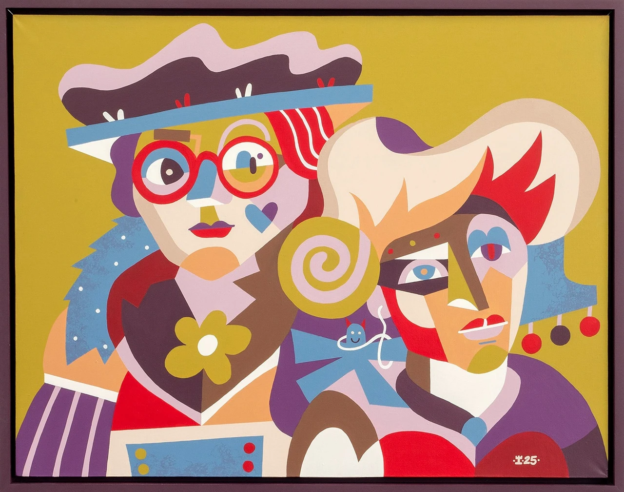 Композиция представляет собой стилизованные портреты, выполненные в яркой, геометрической манере. Насыщенная палитра создает динамичное взаимодействие форм. Живопись отличается четкими линиями и плоскими цветовыми плоскостями, что придает изображению графичность и выразительность. Фигуры расположены близко друг к другу, создавая ощущение близости и диалога.