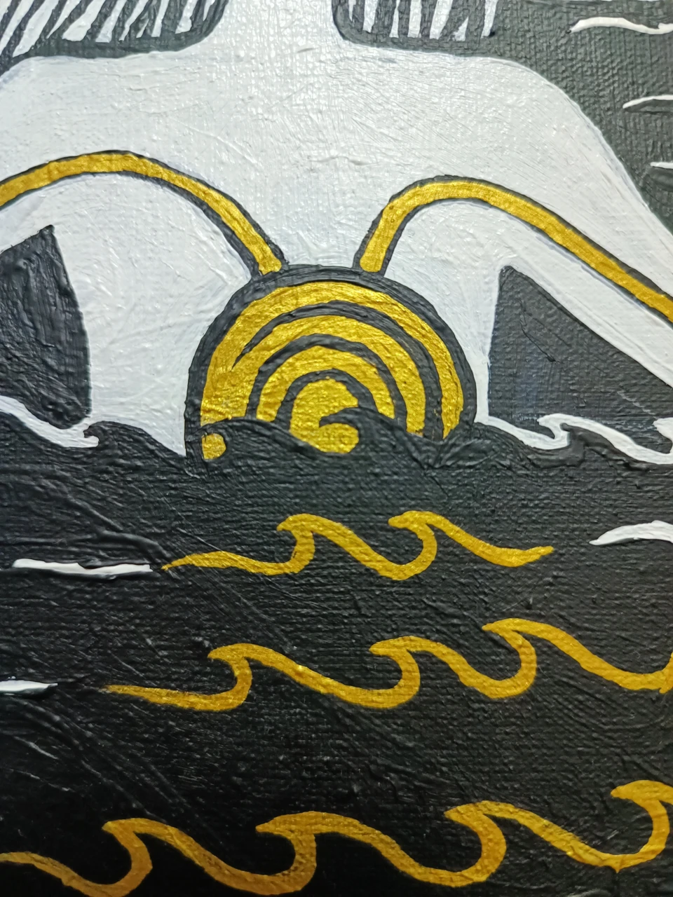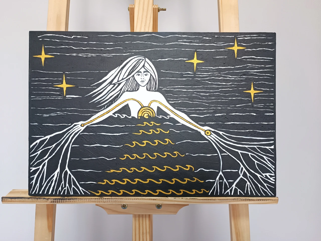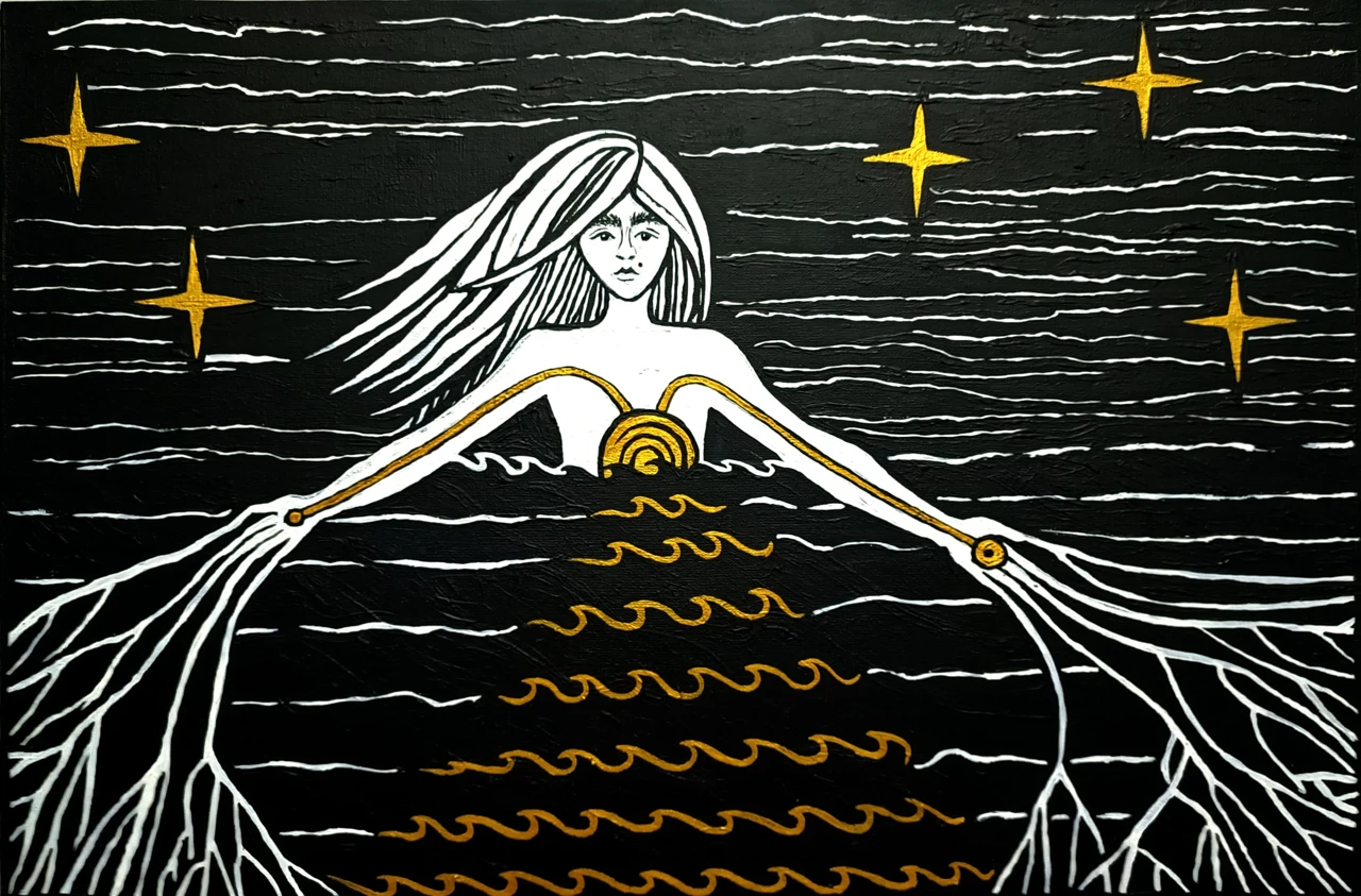 Работа из серии «Образ мира», в которой исследуется взаимосвязь внутреннего и внешнего пространств человека. Фигура женщины, возникающая из водной стихии, олицетворяет созидательную силу, соединяющую землю, небо и подсознание.