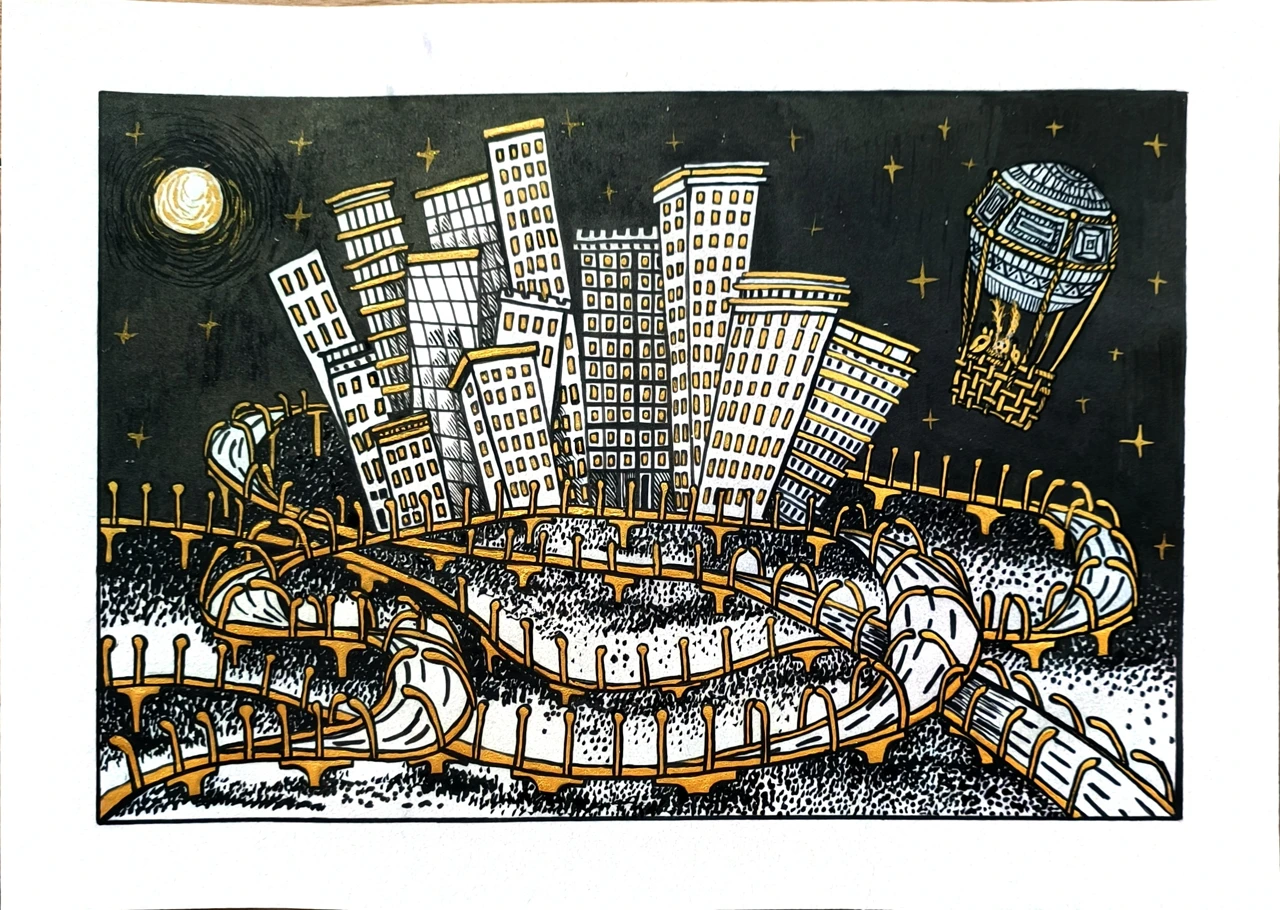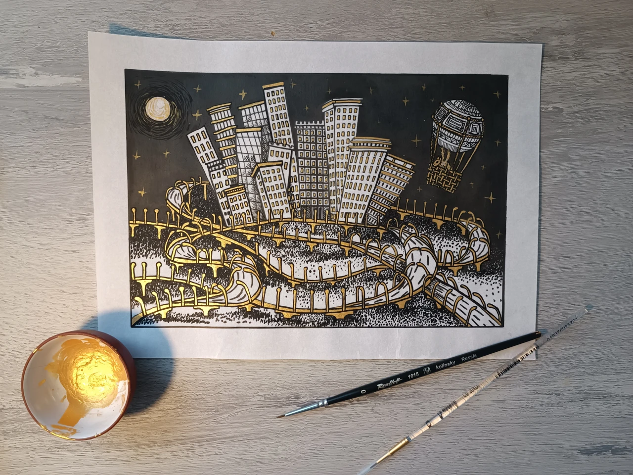 Город во сне изгибается под светом зимней луны, а золотые мосты тянутся, словно дороги, в новый год — непрямые, живые, полные ожиданий. Воздушный шар тихо плывёт над башнями, напоминая о мечте, которая всегда на расстоянии взгляда вверх. Она создаёт атмосферу предновогодней магии — момента, когда всё ещё возможно и впереди открываются новые пути. Идеальный арт-объект для тех, кто любит дарить не вещь, а настроение, символ надежды и начала.