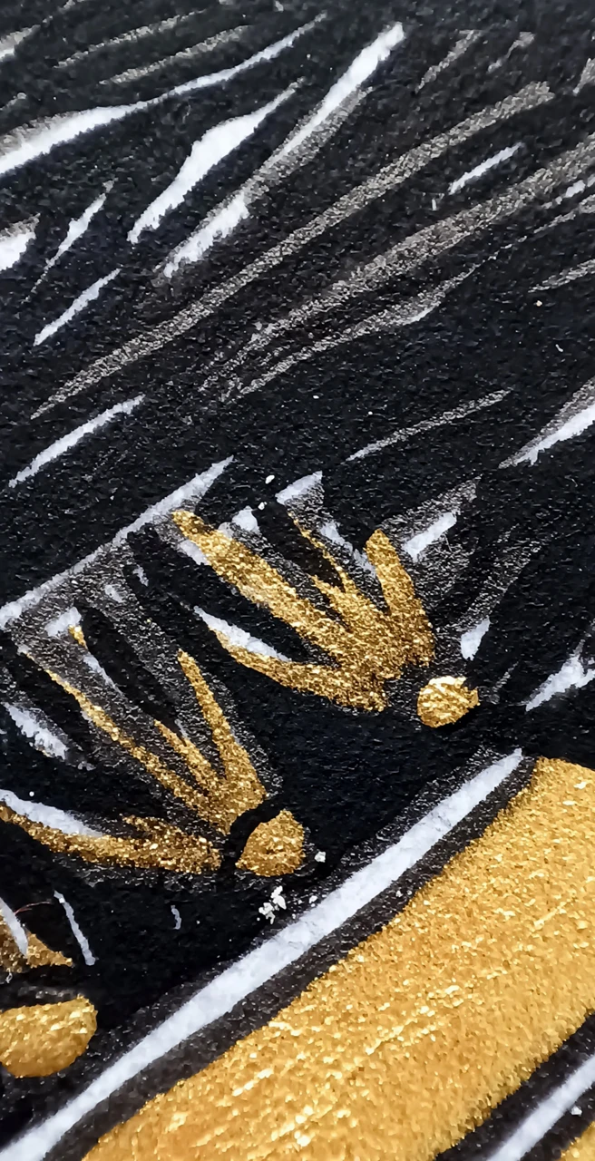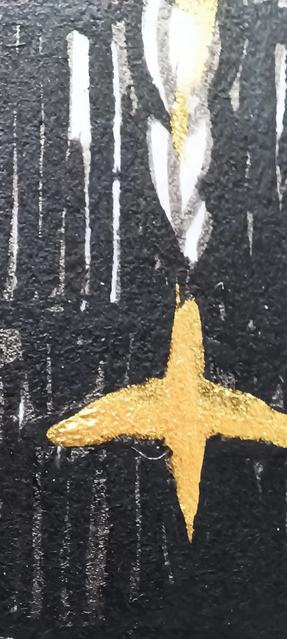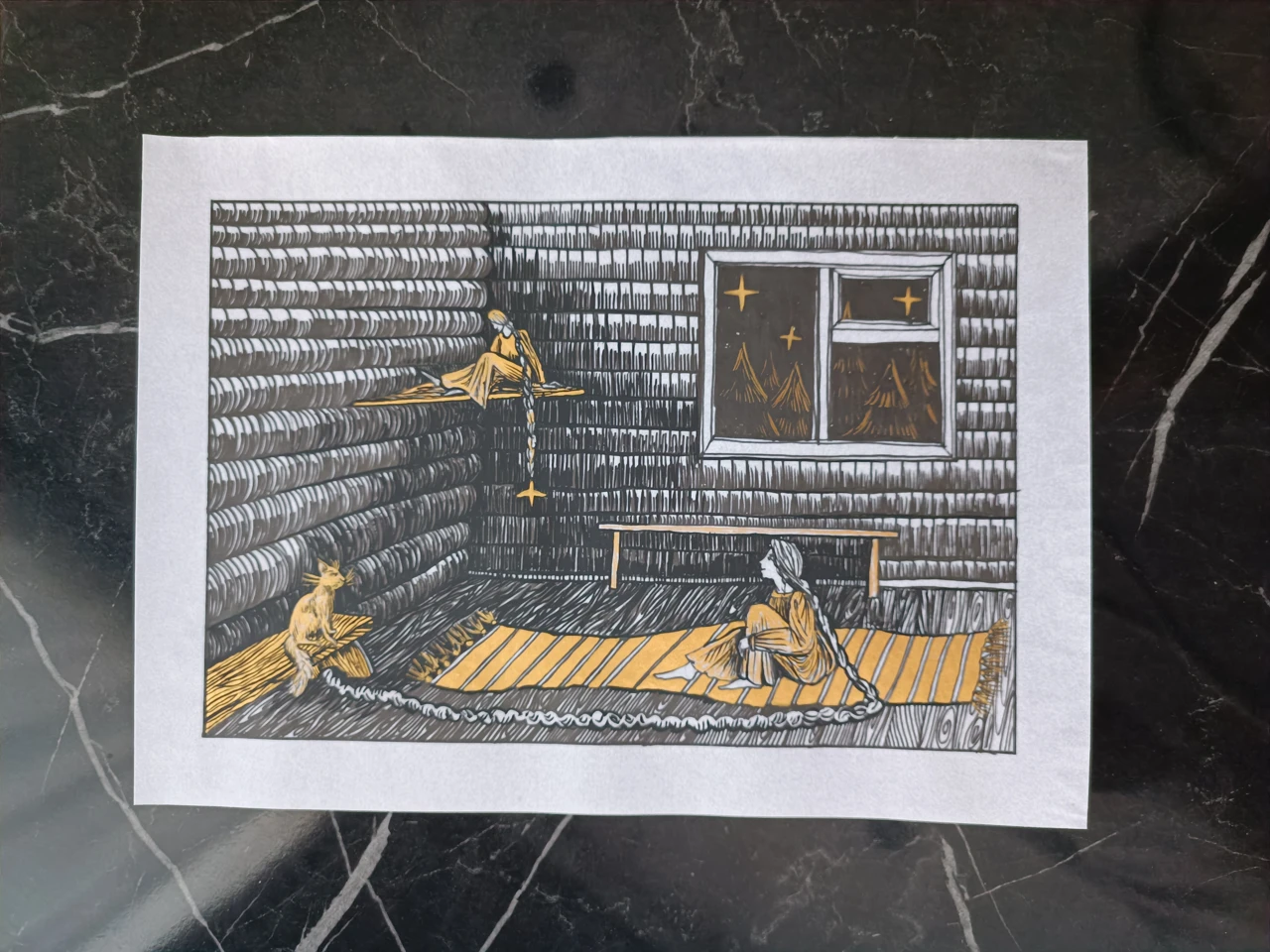 Это тихая, почти сказочная сцена внутри старого деревянного дома, где мерцающий золотой свет соединяет героев с ночным миром за окном. Две женские фигуры и кот оказываются вовлечены в общее пространство тишины и ожидания, а длинная золотая коса становится визуальной нитью, связывающей верх и низ, сон и реальность, земное и небесное. Работа сочетает в себе мотивы народной графики и современного минималистичного повествования, создавая атмосферу, в которой время будто останавливается. Это образ о внутреннем покое, магии домашнего пространства и хрупкой красоте ночного света.