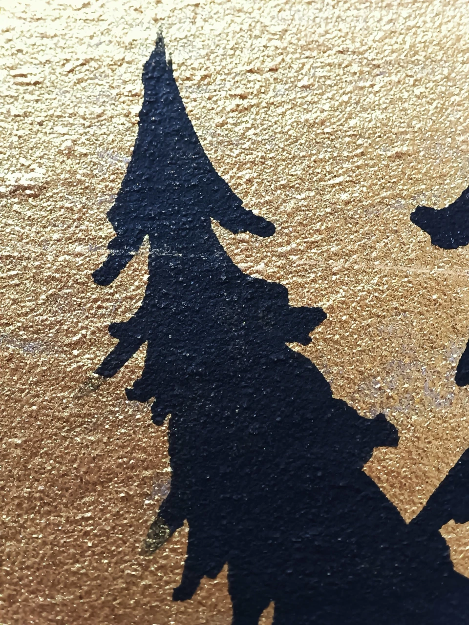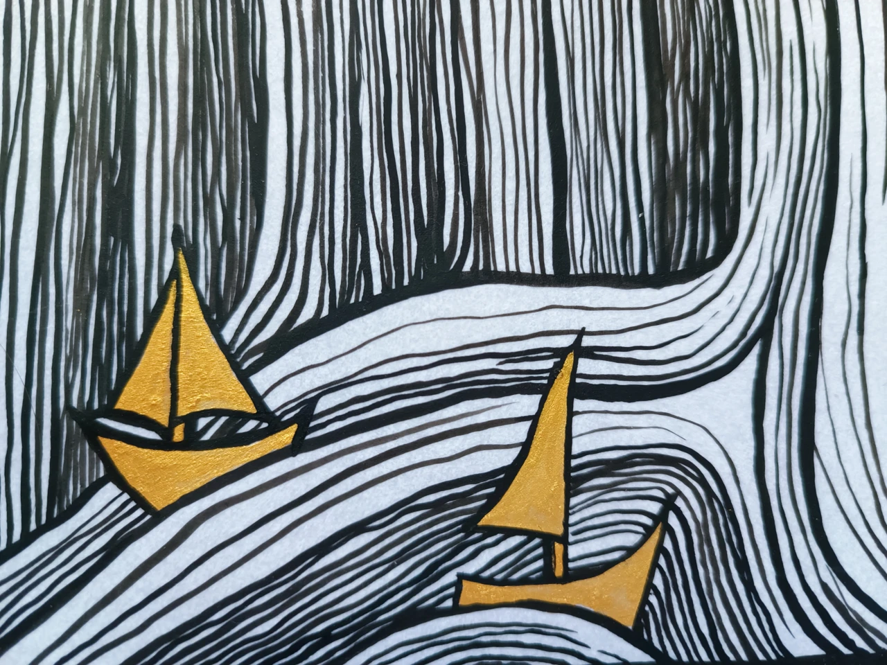 В этой работе oDreams изображает фантазийный мир, в котором две мощные стены водопада сходятся в глубокой долине, а над ними раскрывается сияющее золотое небо. Чёткая линейная графика создаёт ритм и движение воды, превращая пейзаж в гармоничную визуальную волну. Золотые лодки, разбросанные внизу, привносят ощущение путешествия и хрупкой человеческой истории среди величия природных форм. Лесные силуэты по краю композиции подчеркивают контраст между спокойствием горизонта и динамикой ниспадающей воды. Работа объединяет элементы современного иллюстративного искусства, природной символики и сновидческой атмосферы, делая её выразительным акцентом для интерьера и коллекций современного декоративного искусства.