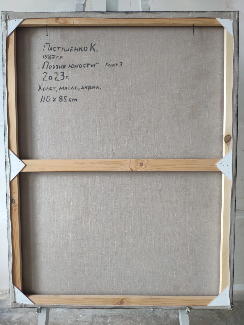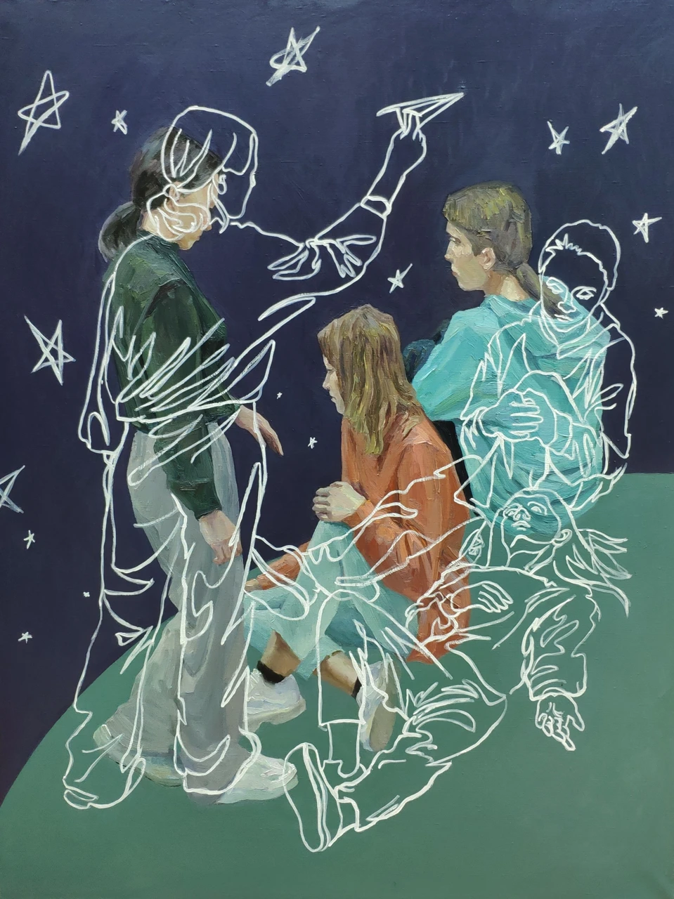 На холсте изображены девочки, школьницы, сидящие словно на краю земли. Они замерли, наблюдая за тем, что скрыто от наших глаз. Поверх живописного решения набросочными линиями акрилом изображены те же девочки, но их не интересует существующее за краем земли. Они увлечены дружеским диалогом и собственными мечтами.