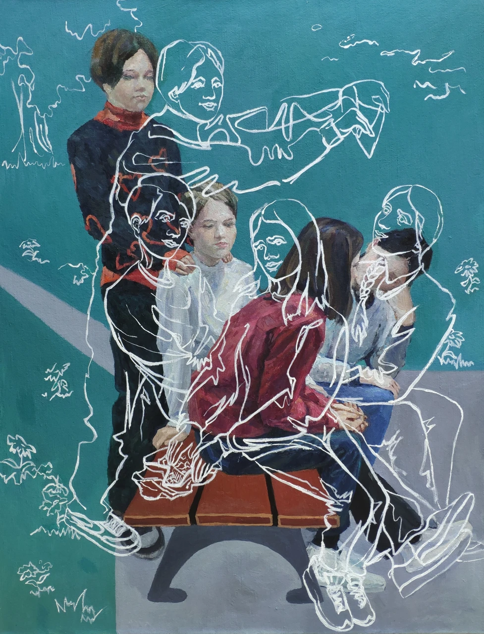 На холсте изображены девочки, школьницы, сидящие в условно изображённом дворе дома или парке. Мир вокруг пуст и безжизненен, движение фигур статичное. Поверх живописного решения набросочными линиями акрилом изображены те же девочки, занятые общением и вовлечённые в мир, наполненный жизнью и мечтами.