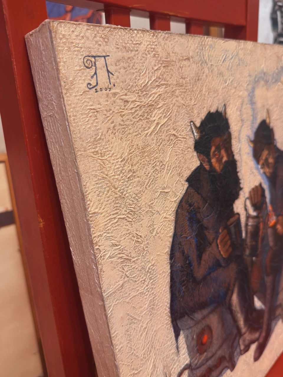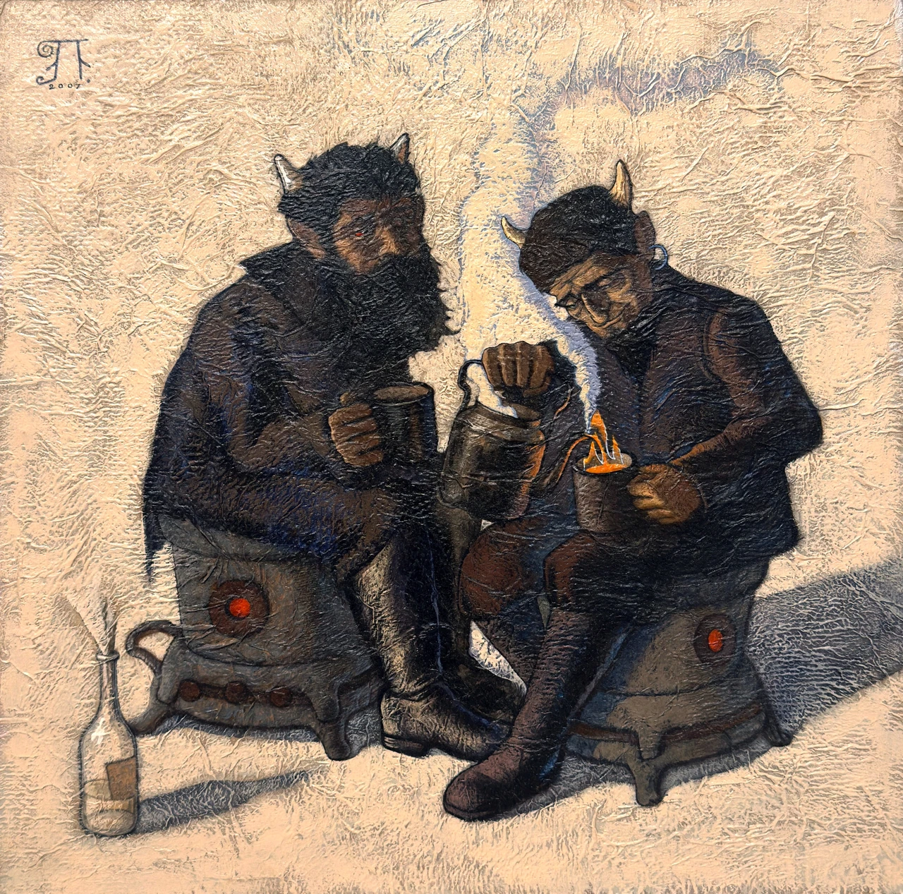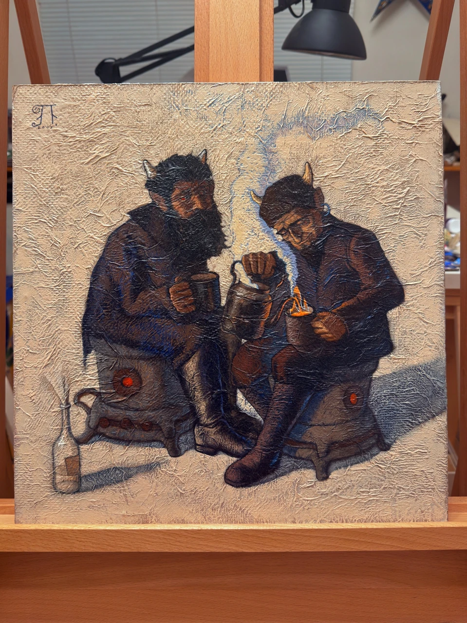 Картина про двух чертей, сидящих на «керосинках», и распивающих керосин...