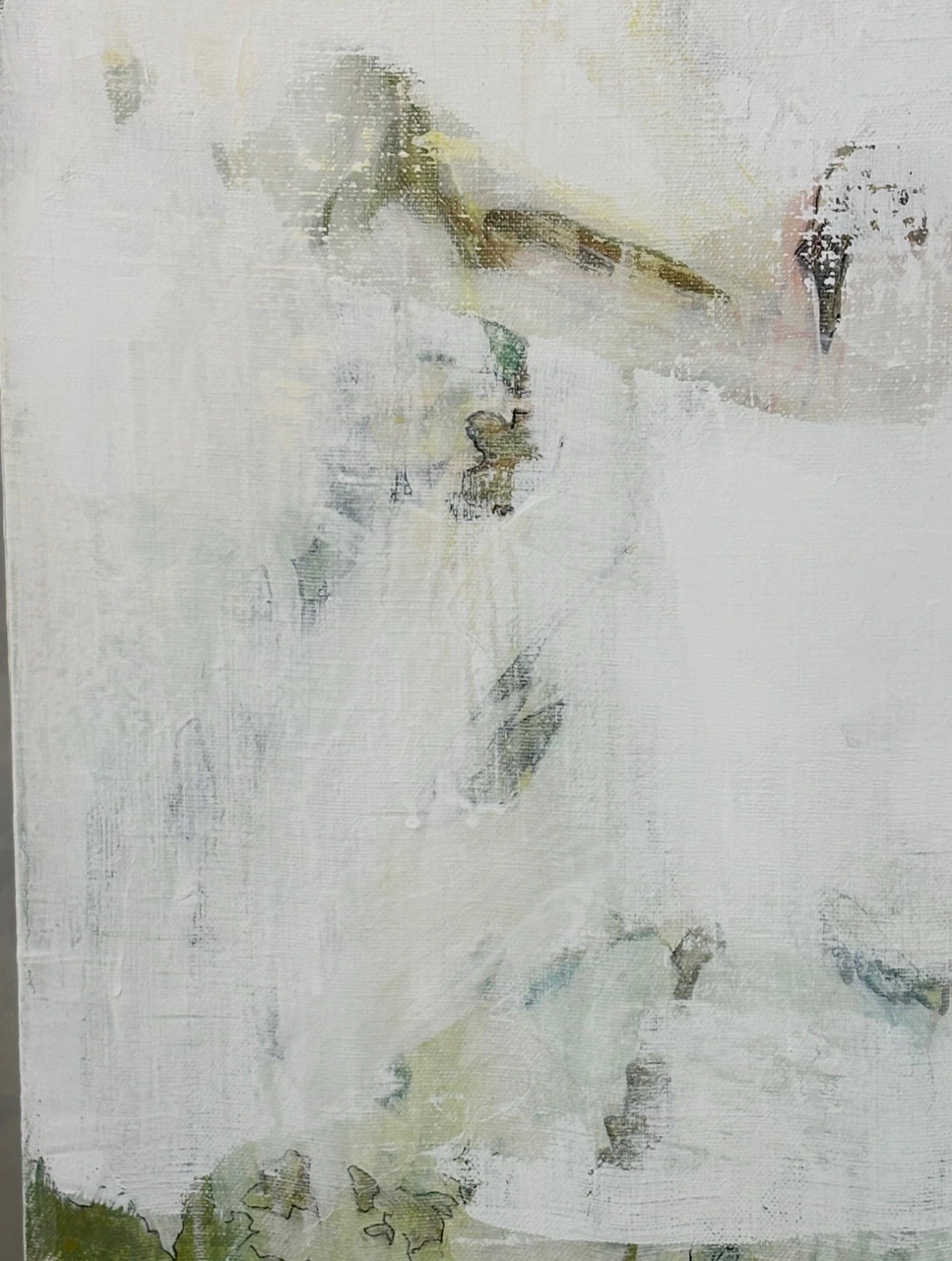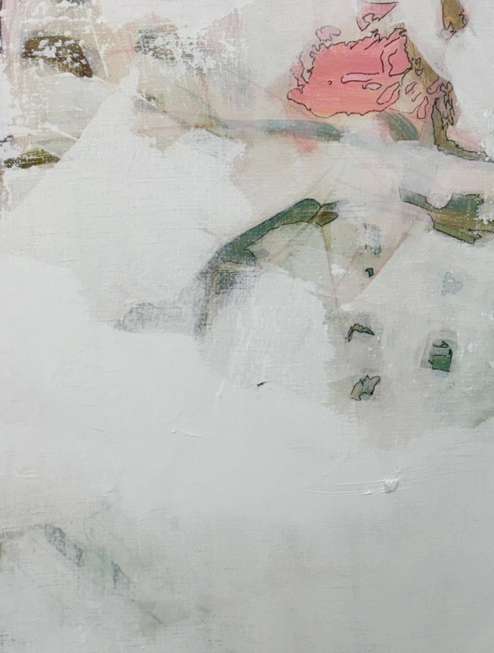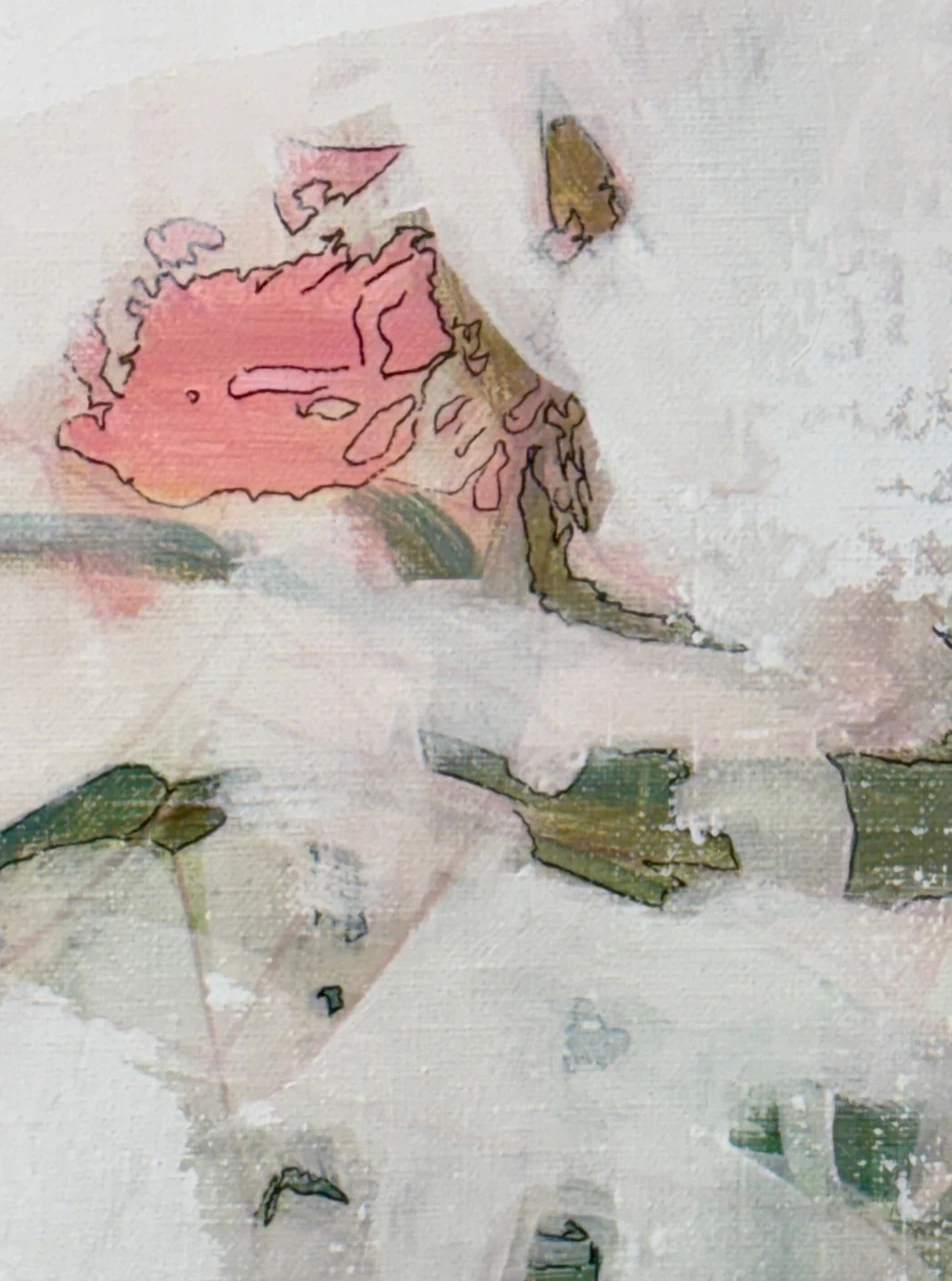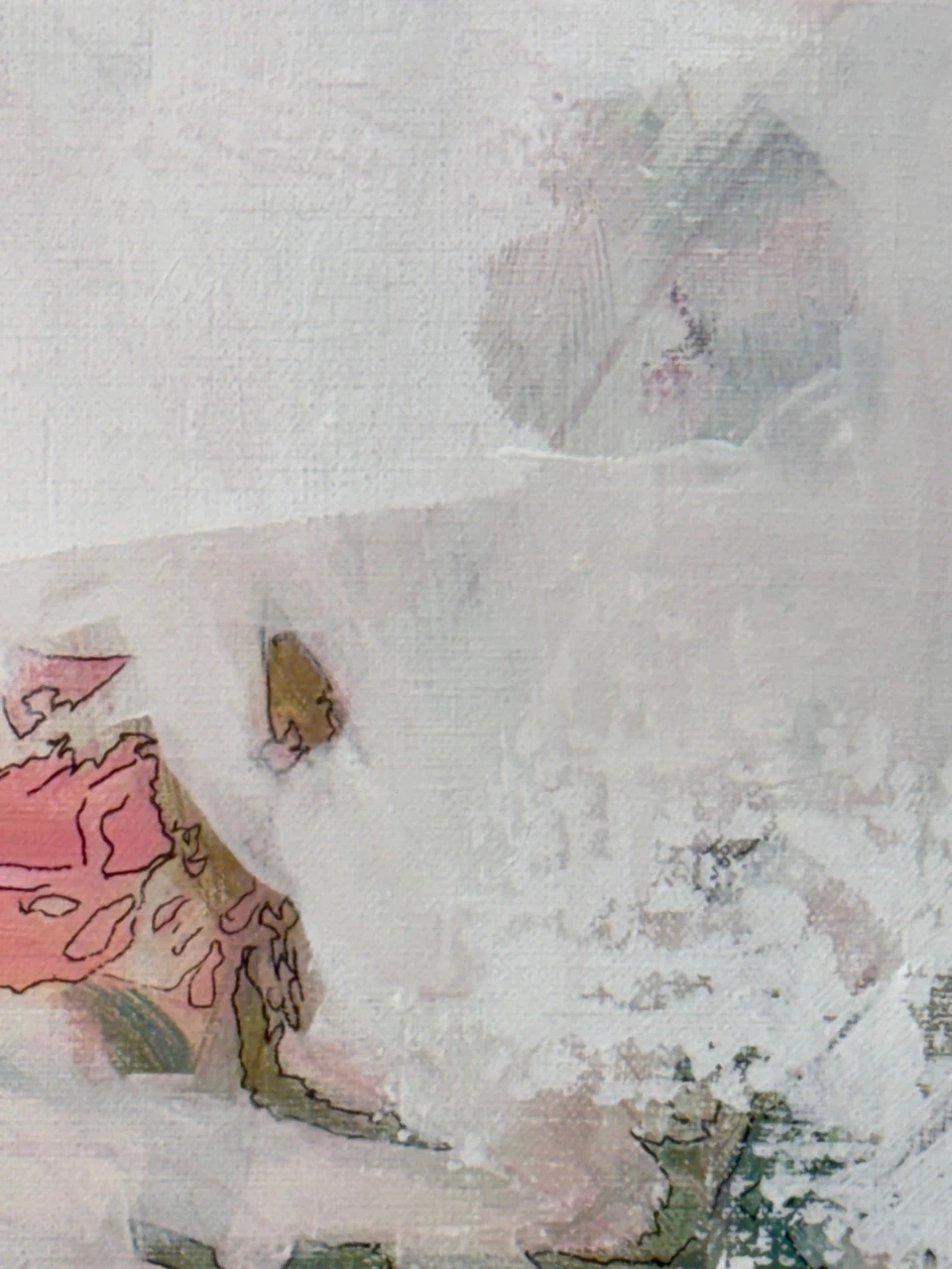 В работе используется техника многочисленных промывок медиума на водной основе: акрил, тушь, темпера. Черный контур вызывает ассоциации с традиционной китайской живописью