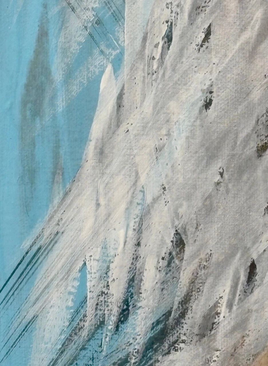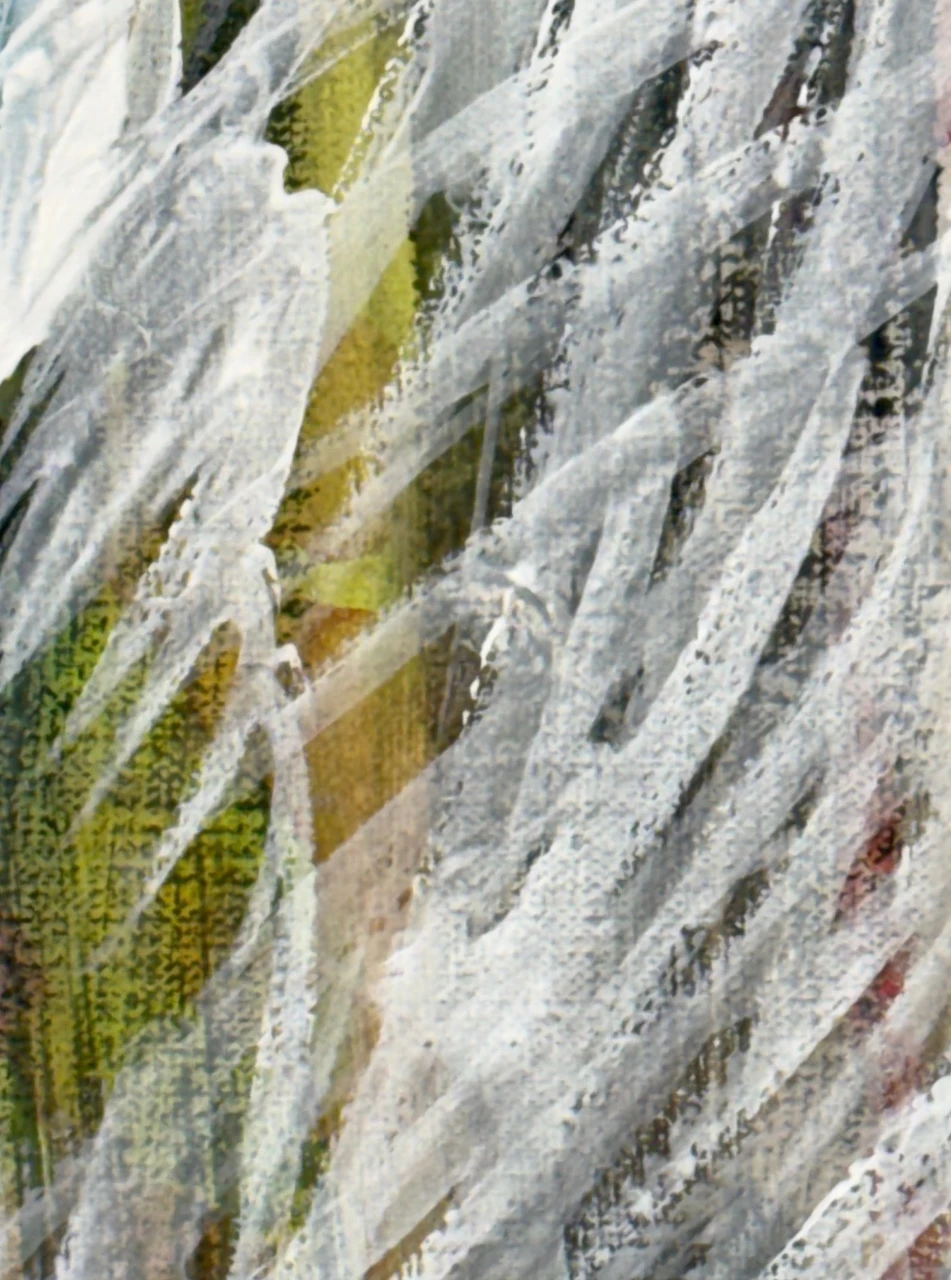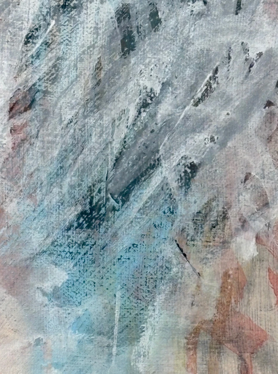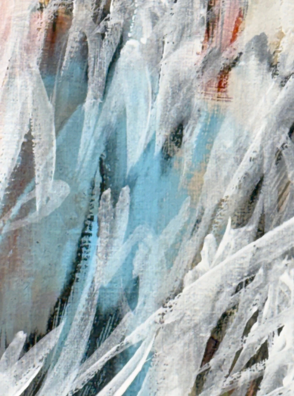 В работе используется техника многочисленных промывок медиума на водной основе: акрил, тушь, темпера. Черный контур вызывает ассоциации с традиционной китайской живописью