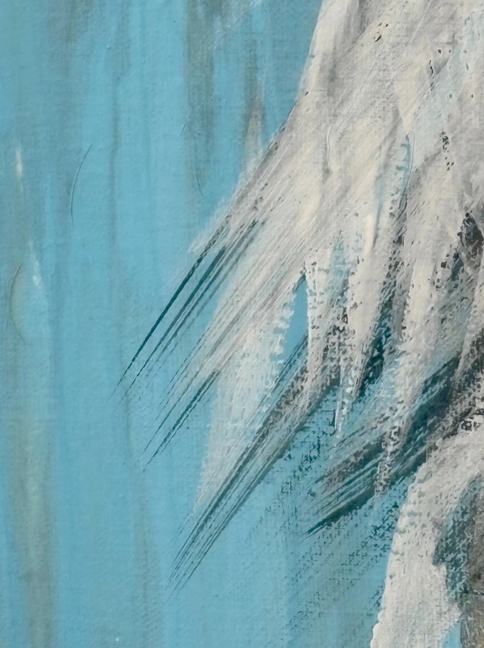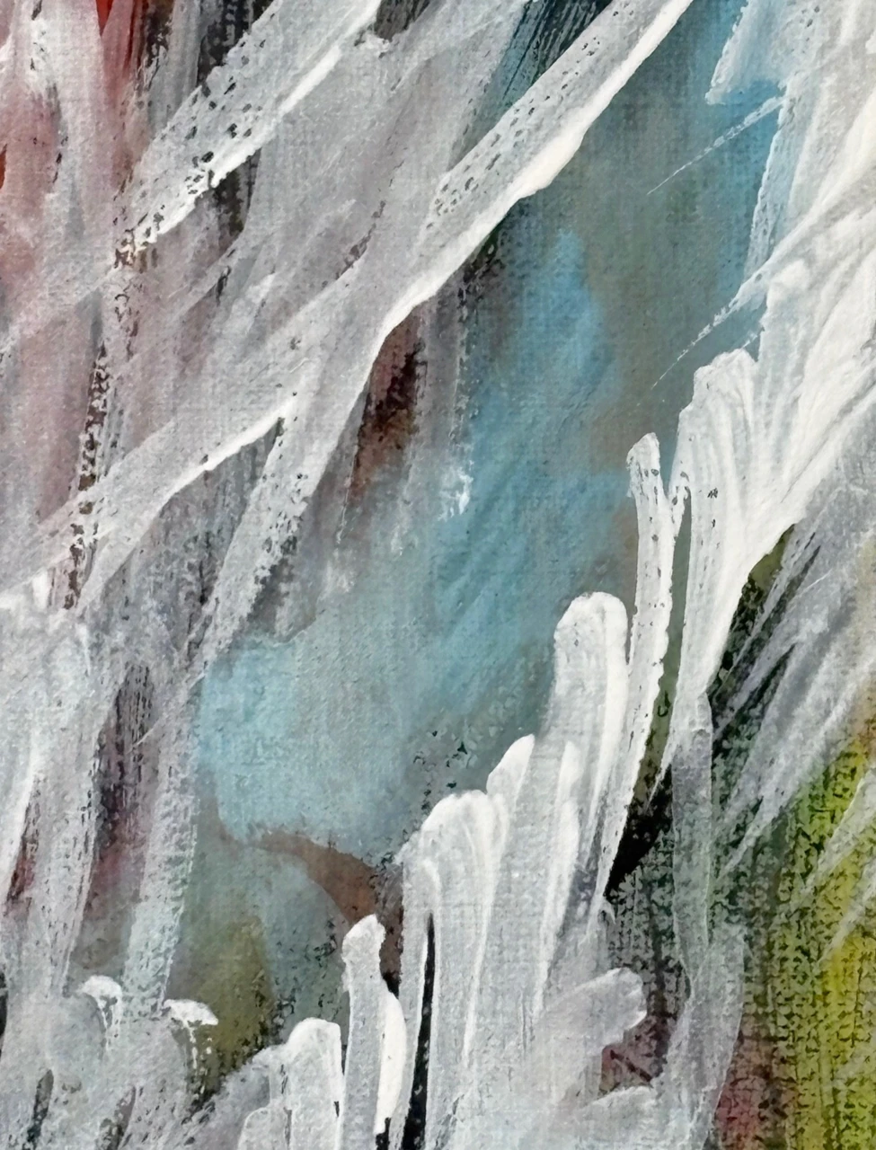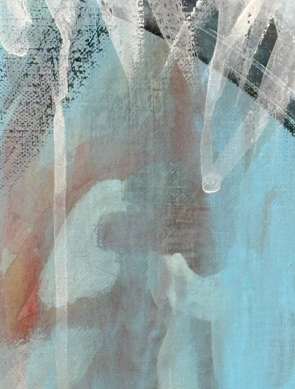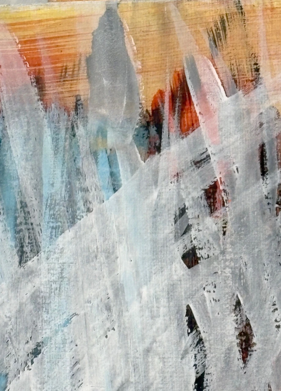 В работе используется техника многочисленных промывок медиума на водной основе: акрил, тушь, темпера. Черный контур вызывает ассоциации с традиционной китайской живописью