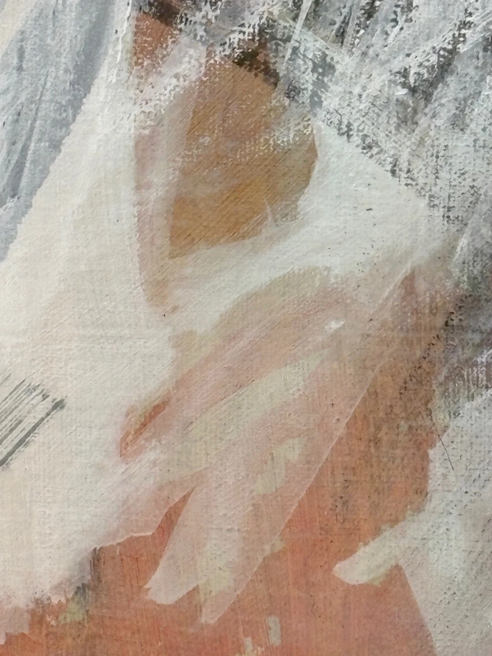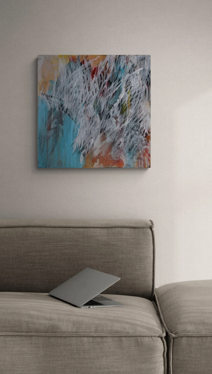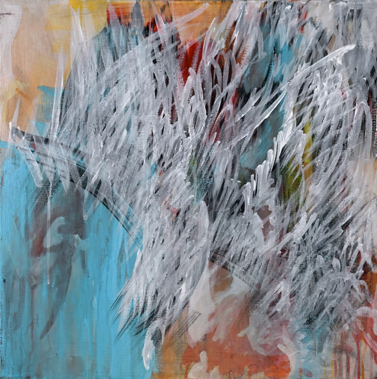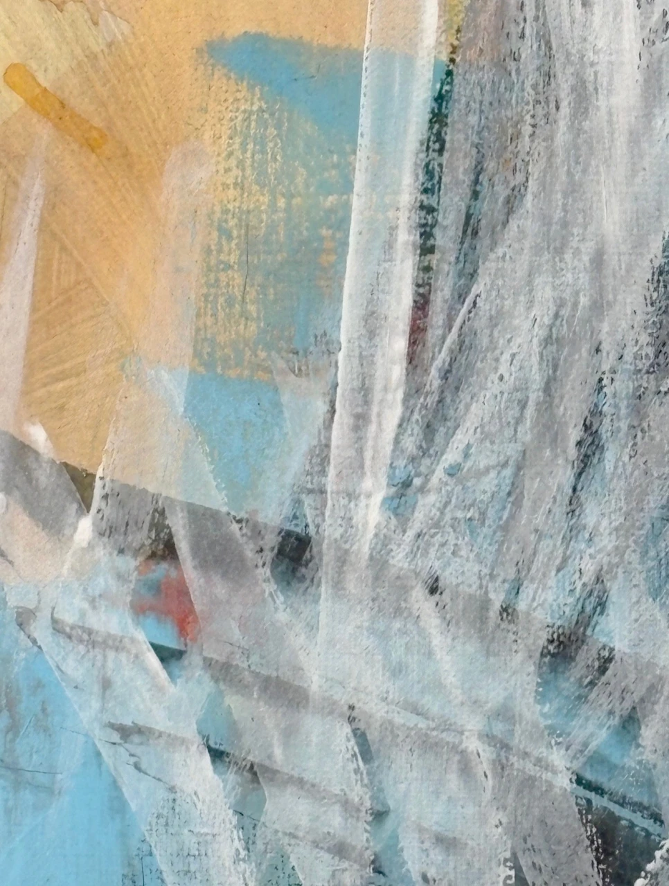 В работе используется техника многочисленных промывок медиума на водной основе: акрил, тушь, темпера. Черный контур вызывает ассоциации с традиционной китайской живописью